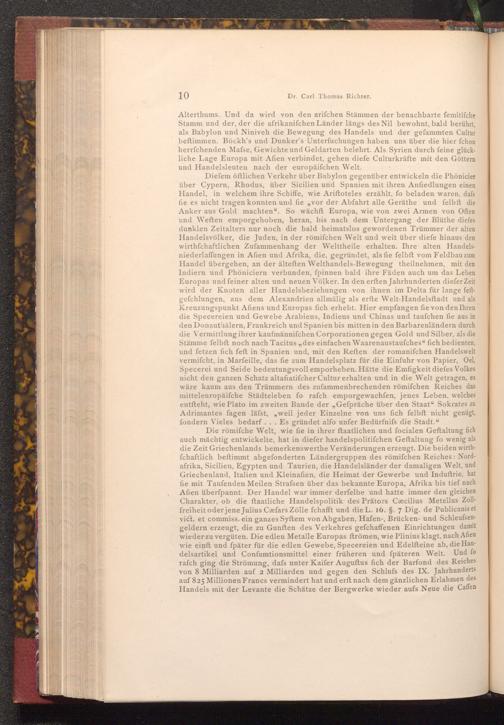 Die römifche Welt, wie fie in ihrer ftaatlichen und focialen Geftaltung fich auch mächtig entwickelte, hat in diefer handelspolitifchen Geftaltung fo wenig als die Zeit Griechenlands bemerkenswerthe Veränderungen erzeugt. Die beiden wirthfchaftlich beftimmt abgefonderten Ländergruppen des römifchen Reiches: Nordafrika, Sicilien, Egypten und Taurien, die Handelsländer der damaligen Welt, und Griechenland, Italien und Kleinafien, die Heimat der Gewerbe und Induftrie, hat fie mit Taufenden Meilen Strafsen über das bekannte Europa, Afrika bis tief nach Afien überfpannt. Der Handel war immer derfelbe und hatte immer den gleichen Charakter, ob die ftaatliche Handelspolitik des Prätors Cæcilius Metellus Zollfreiheit oder jene Julius Cæfars Zölle fchafft und die L. 16.§. 7 Dig. de Publicanis et vict. et commiss. ein ganzes Syftem von Abgaben, Hafen-, Brücken- und Schleufsengeldern erzeugt, die zu Gunften des Verkehres gefchaffenen Einrichtungen damit wieder zu vergüten. Die edlen Metalle Europas ftrömen, wie Plinius klagt, nach Afien wie einft und später für die edlen Gewebe, Specereien und Edelſteine ab, die Handelsartikel und Confumtionsmittel einer früheren und späteren Welt. Und fo rafch ging die Strömung, dafs unter Kaifer Auguftus fich der Barfond des Reiches von 8 Milliarden auf 2 Milliarden und gegen den Schlufs des IX. Jahrhunderts auf 825 Millionen Francs vermindert hat und erft nach dem gänzlichen Erlahmen des Handels mit der Levante die Schätze der Bergwerke wieder aufs Neue die Caffen