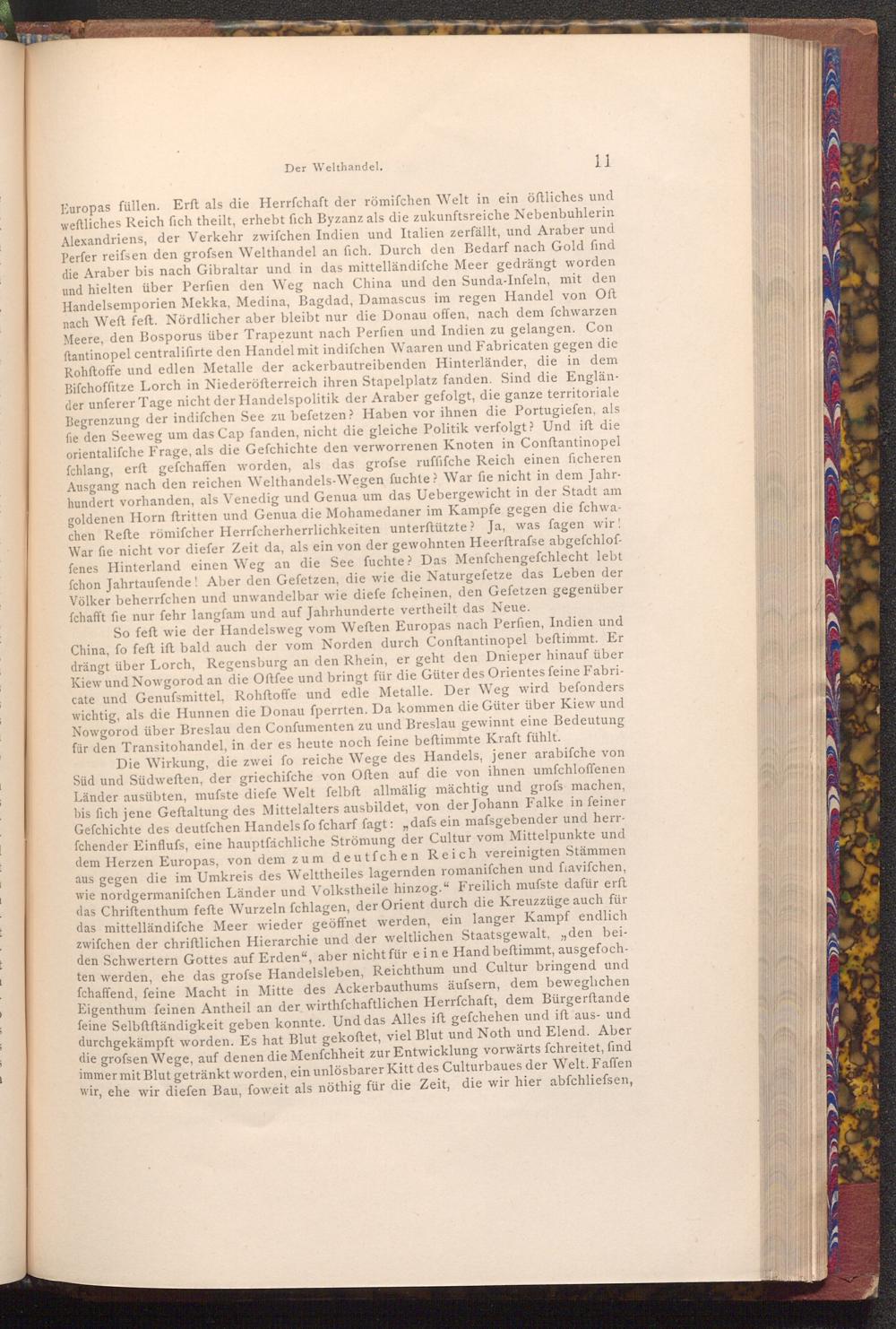 Die Wirkung, die zwei fo reiche Wege des Handels, jener arabifche von Süd und Südweften, der griechifche von Often auf die von ihnen umfchloffenen Länder ausübten, mufste diefe Welt felbft allmälig mächtig und grofs machen, bis fich jene Geftaltung des Mittelalters ausbildet, von der Johann Falke in feiner Gefchichte des deutfchen Handels fo fcharf fagt:", dafs ein mafsgebender und herrfchender Einflufs, eine hauptfächliche Strömung der Cultur vom Mittelpunkte und dem Herzen Europas, von dem zum deutfchen Reich vereinigten Stämmen aus gegen die im Umkreis des Welttheiles lagernden romanifchen und fiavifchen, wie nordgermanifchen Länder und Volkstheile hinzog." Freilich mufste dafür erft das Chriftenthum fefte Wurzeln fchlagen, der Orient durch die Kreuzzüge auch für das mittelländifche Meer wieder geöffnet werden, ein langer Kampf endlich zwifchen der chriftlichen Hierarchie und der weltlichen Staatsgewalt, den beiden Schwertern Gottes auf Erden", aber nicht für eine Hand beftimmt, ausgefochten werden, ehe das grofse Handelsleben, Reichthum und Cultur bringend und fchaffend, feine Macht in Mitte des Ackerbauthums äufsern, dem beweglichen Eigenthum feinen Antheil an der wirthschaftlichen Herrfchaft, dem Bürgerftande feine Selbftftändigkeit geben konnte. Und das Alles ift gefchehen und ift aus- und durchgekämpft worden. Es hat Blut gekoftet, viel Blut und Noth und Elend. Aber die grofsen Wege, auf denen die Menfchheit zur Entwicklung vorwärts fchreitet, find immer mit Blut getränkt worden, ein unlösbarer Kitt des Culturbaues der Welt. Faffen wir, ehe wir diefen Bau, foweit als nöthig für die Zeit, die wir hier abfchliefsen,