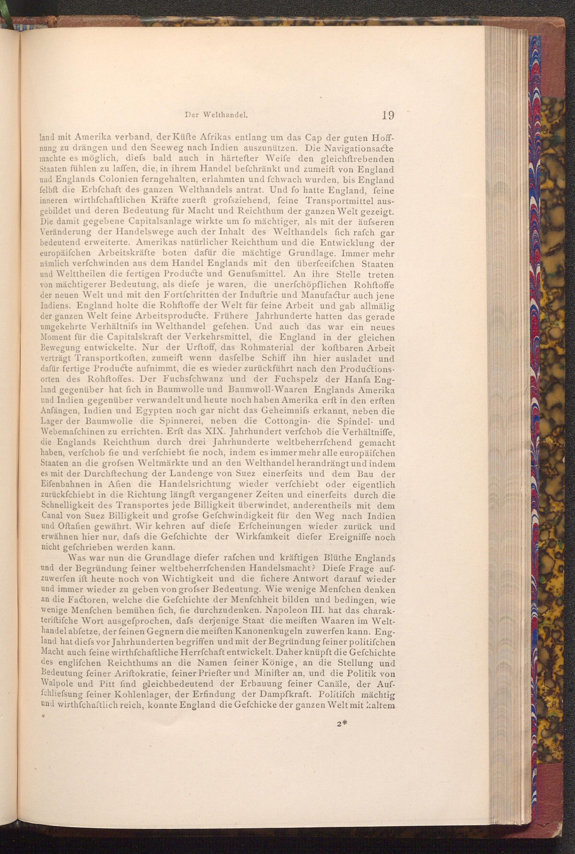 Was war nun die Grundlage diefer rafchen und kräftigen Blüthe Englands und der Begründung feiner weltbeherrschenden Handelsmacht? Diefe Frage aufzuwerfen ift heute noch von Wichtigkeit und die fichere Antwort darauf wieder und immer wieder zu geben von grofser Bedeutung. Wie wenige Menfchen denken an die Factoren, welche die Gefchichte der Menfchheit bilden und bedingen, wie wenige Menfchen bemühen fich, fie durchzudenken. Napoleon III. hat das charakteriftifche Wort ausgefprochen, dafs derjenige Staat die meiſten Waaren im Welthandel abfetze, der feinen Gegnern die meiſten Kanonenkugeln zuwerfen kann. England hat diefs vor Jahrhunderten begriffen und mit der Begründung feiner politifchen Macht auch feine wirthschaftliche Herrfchaft entwickelt. Daher knüpft die Gefchichte des englifchen Reichthums an die Namen feiner Könige, an die Stellung und Bedeutung feiner Ariftokratie, feiner Priefter und Minifter an, und die Politik von Walpole und Pitt find gleichbedeutend der Erbauung feiner Canäle, der Auffchliefsung feiner Kohlenlager, der Erfindung der Dampfkraft. Politifch mächtig und wirthschaftlich reich, konnte England die Gefchicke der ganzen Welt mit kaltem