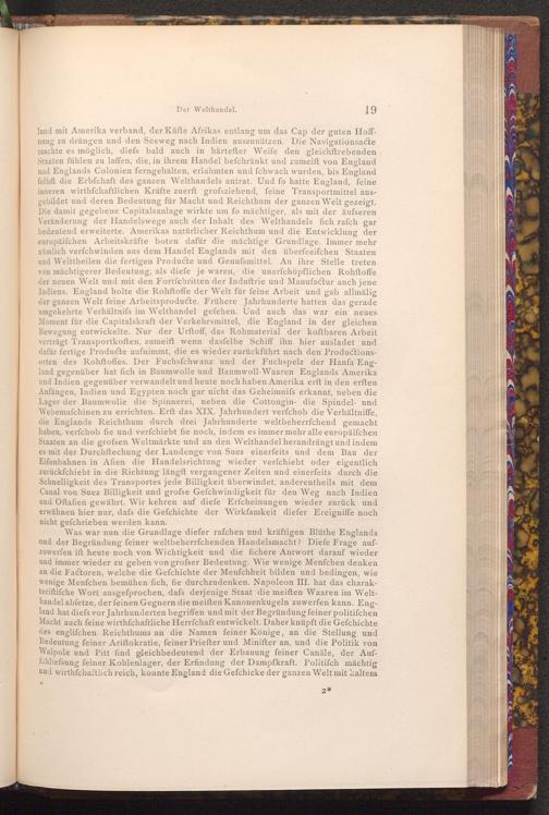land mit Amerika verband, der Küfte Afrikas entlang um das Cap der guten Hoffnung zu drängen und den Seeweg nach Indien auszunützen. Die Navigationsacte machte es möglich, diefs bald auch in härtefter Weife den gleichftrebenden Staaten fühlen zu laffen, die, in ihrem Handel befchränkt und zumeift von England und Englands Colonien ferngehalten, erlahmten und fchwach wurden, bis England felbft die Erbfchaft des ganzen Welthandels antrat. Und fo hatte England, feine inneren wirthfchaftlichen Kräfte zuerft grofsziehend, feine Transportmittel ausgebildet und deren Bedeutung für Macht und Reichthum der ganzen Welt gezeigt. Die damit gegebene Capitalsanlage wirkte um fo mächtiger, als mit der äufseren Veränderung der Handelswege auch der Inhalt des Welthandels fich rafch gar bedeutend erweiterte. Amerikas natürlicher Reichthum und die Entwicklung der europäiſchen Arbeitskräfte boten dafür die mächtige Grundlage. Immer mehr nämlich verfchwinden aus dem Handel Englands mit den überfeeifchen Staaten und Welttheilen die fertigen Producte und Genufsmittel. An ihre Stelle treten von mächtigerer Bedeutung, als diefe je waren, die unerfchöpflichen Rohftoffe. der neuen Welt und mit den Fortfchritten der Induftrie und Manufactur auch jene Indiens. England holte die Rohftoffe der Welt für feine Arbeit und gab allmälig der ganzen Welt feine Arbeitsproducte. Frühere Jahrhunderte hatten das gerade umgekehrte Verhältnifs im Welthandel gefehen. Und auch das war ein neues Moment für die Capitalskraft der Verkehrsmittel, die England in der gleichen Bewegung entwickelte. Nur der Urftoff, das Rohmaterial der koftbaren Arbeit verträgt Transportkoften, zumeift wenn dasfelbe Schiff ihn hier ausladet und dafür fertige Producte aufnimmt, die es wieder zurückführt nach den Productionsorten des Rohftoffes. Der Fuchsfchwanz und der Fuchspelz der Hanfa England gegenüber hat fich in Baumwolle und Baumwoll- Waaren Englands Amerika und Indien gegenüber verwandelt und heute noch haben Amerika erft in den erften Anfängen, Indien und Egypten noch gar nicht das Geheimnifs erkannt, neben die Lager der Baumwolle die Spinnerei, neben die Cottongin- die Spindel- und Webemafchinen zu errichten. Erft das XIX. Jahrhundert verfchob die Verhältniffe, die Englands Reichthum durch drei Jahrhunderte weltbeherrfchend gemacht haben, verfchob fie und verfchiebt fie noch, indem es immer mehr alle europäiſchen Staaten an die grofsen Weltmärkte und an den Welthandel herandrängt und indem es mit der Durchftechung der Landenge von Suez einerfeits und dem Bau der Eifenbahnen in Afien die Handelsrichtung wieder verfchiebt oder eigentlich zurückfchiebt in die Richtung längft vergangener Zeiten und einerfeits durch die Schnelligkeit des Transportes jede Billigkeit überwindet, anderentheils mit dem Canal von Suez Billigkeit und grofse Gefchwindigkeit für den Weg nach Indien und Oftafien gewährt. Wir kehren auf diefe Erfcheinungen wieder zurück und erwähnen hier nur, dafs die Gefchichte der Wirkfamkeit diefer Ereigniffe noch nicht gefchrieben werden kann.