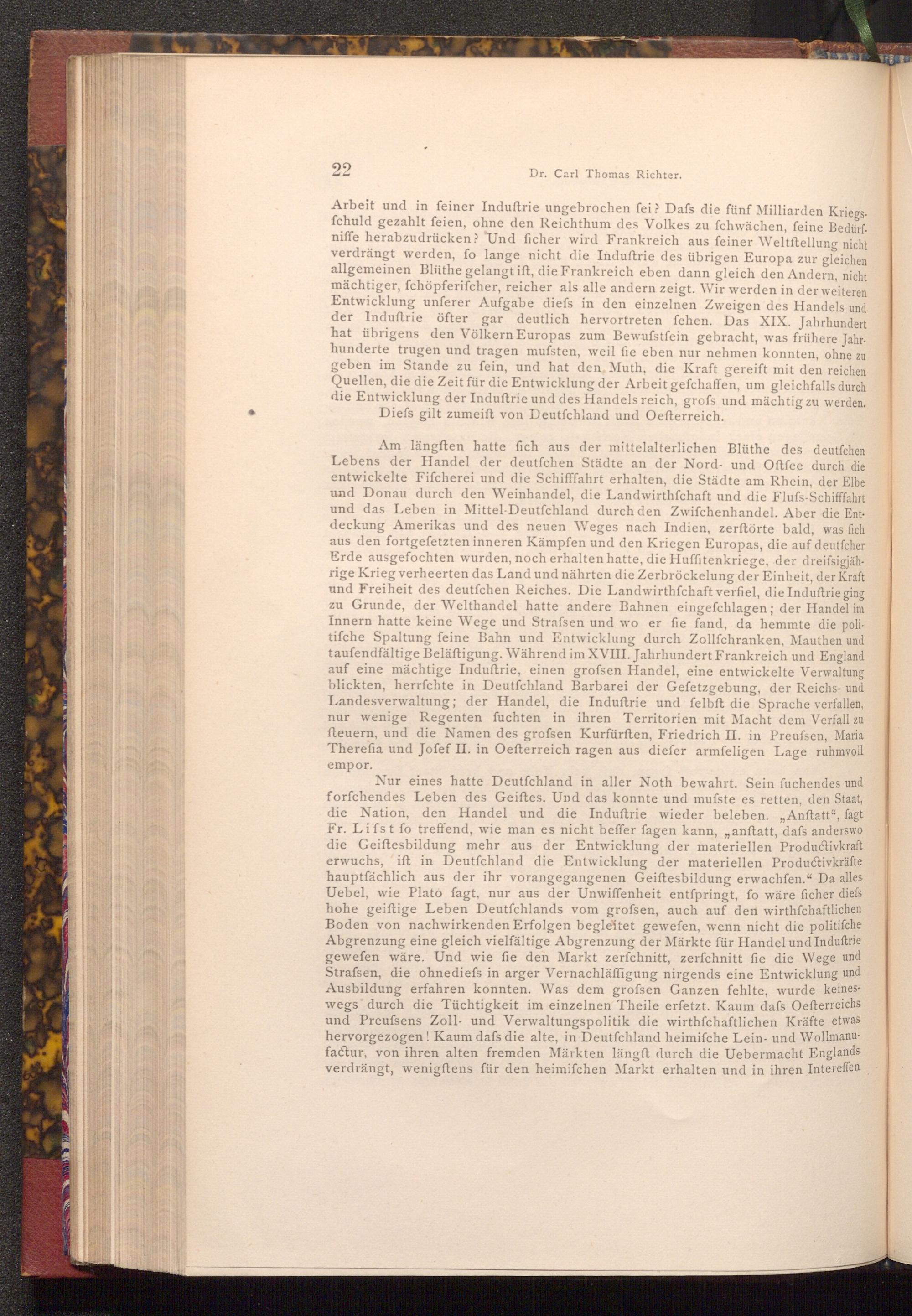 Nur eines hatte Deutſchland in aller Noth bewahrt. Sein fuchendes und forfchendes Leben des Geiftes. Und das konnte und mufste es retten, den Staat, die Nation, den Handel und die Induftrie wieder beleben." Anftatt", fagt Fr. Lifst fo treffend, wie man es nicht beffer fagen kann, anftatt, dafs anderswo die Geiftesbildung mehr aus der Entwicklung der materiellen Productivkraft erwuchs, ift in Deutfchland die Entwicklung der materiellen Productivkräfte hauptfächlich aus der ihr vorangegangenen Geiftesbildung erwachfen." Da alles Uebel, wie Plato fagt, nur aus der Unwiffenheit entſpringt, fo wäre ficher diefs hohe geiftige Leben Deutſchlands vom grofsen, auch auf den wirthfchaftlichen Boden von nachwirkenden Erfolgen begleitet gewefen, wenn nicht die politifche Abgrenzung eine gleich vielfältige Abgrenzung der Märkte für Handel und Induſtrie gewefen wäre. Und wie fie den Markt zerfchnitt, zerfchnitt fie die Wege und Strafsen, die ohnediefs in arger Vernachläffigung nirgends eine Entwicklung und Ausbildung erfahren konnten. Was dem grofsen Ganzen fehlte, wurde keineswegs durch die Tüchtigkeit im einzelnen Theile erfetzt. Kaum dafs Oefterreichs und Preussens Zoll- und Verwaltungspolitik die wirthschaftlichen Kräfte etwas hervorgezogen! Kaum dafs die alte, in Deutfchland heimifche Lein- und Wollmanufactur, von ihren alten fremden Märkten längft durch die Uebermacht Englands verdrängt, wenigftens für den heimifchen Markt erhalten und in ihren Intereffen