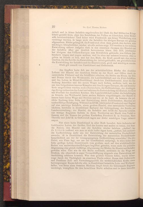 Arbeit und in feiner Induftrie ungebrochen fei? Dafs die fünf Milliarden Kriegsfchuld gezahlt feien, ohne den Reichthum des Volkes zu fchwächen, feine Bedürf niffe herabzudrücken? Und ficher wird Frankreich aus feiner Weltftellung nicht verdrängt werden, fo lange nicht die Induftrie des übrigen Europa zur gleichen allgemeinen Blüthe gelangt ift, die Frankreich eben dann gleich den Andern, nicht mächtiger, fchöpferifcher, reicher als alle andern zeigt. Wir werden in der weiteren Entwicklung unferer Aufgabe diefs in den einzelnen Zweigen des Handels und der Induftrie öfter gar deutlich hervortreten fehen. Das XIX. Jahrhundert hat übrigens den Völkern Europas zum Bewufstfein gebracht, was frühere Jahrhunderte trugen und tragen mufsten, weil fie eben nur nehmen konnten, ohne zu geben im Stande zu fein, und hat den Muth, die Kraft gereift mit den reichen Quellen, die die Zeit für die Entwicklung der Arbeit gefchaffen, um gleichfalls durch die Entwicklung der Induftrie und des Handels reich, grofs und mächtig zu werden. Diefs gilt zumeift von Deutfchland und Oefterreich.