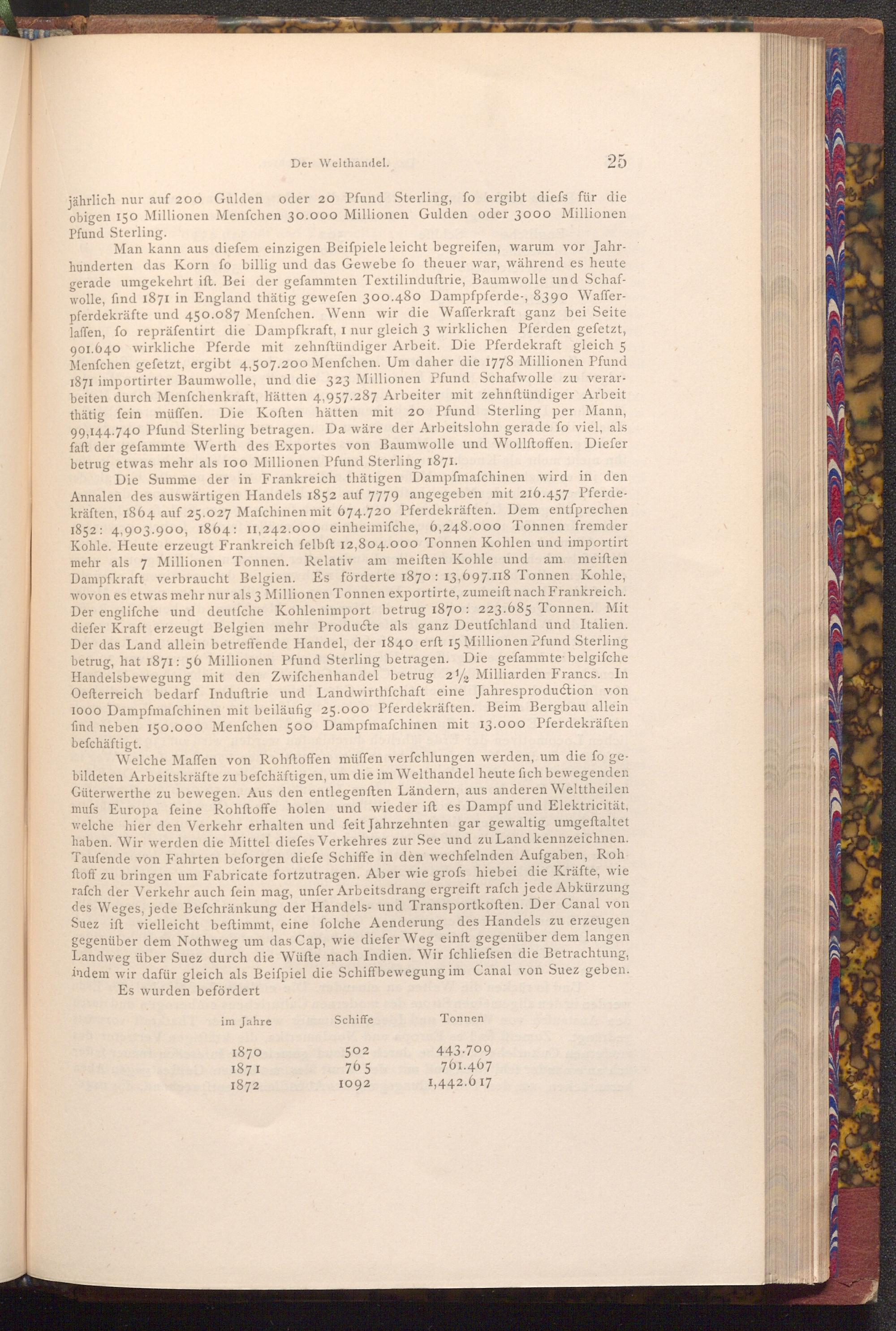Welche Maffen von Rohftoffen müffen verfchlungen werden, um die fo gebildeten Arbeitskräfte zu befchäftigen, um die im Welthandel heute fich bewegenden Güterwerthe zu bewegen. Aus den entlegenften Ländern, aus anderen Welttheilen mufs Europa feine Rohftoffe holen und wieder ift es Dampf und Elektricität, welche hier den Verkehr erhalten und feit Jahrzehnten gar gewaltig umgeftaltet haben. Wir werden die Mittel diefes Verkehres zur See und zu Land kennzeichnen. Taufende von Fahrten beforgen diefe Schiffe in den wechfelnden Aufgaben, Rohftoff zu bringen um Fabricate fortzutragen. Aber wie grofs hiebei die Kräfte, wie rafch der Verkehr auch fein mag, unfer Arbeitsdrang ergreift rafch jede Abkürzung des Weges, jede Befchränkung der Handels- und Transportkoften. Der Canal von Suez ift vielleicht beftimmt, eine folche Aenderung des Handels zu erzeugen gegenüber dem Nothweg um das Cap, wie diefer Weg einft gegenüber dem langen Landweg über Suez durch die Wüfte nach Indien. Wir fchliefsen die Betrachtung, indem wir dafür gleich als Beiſpiel die Schiffbewegung im Canal von Suez geben.