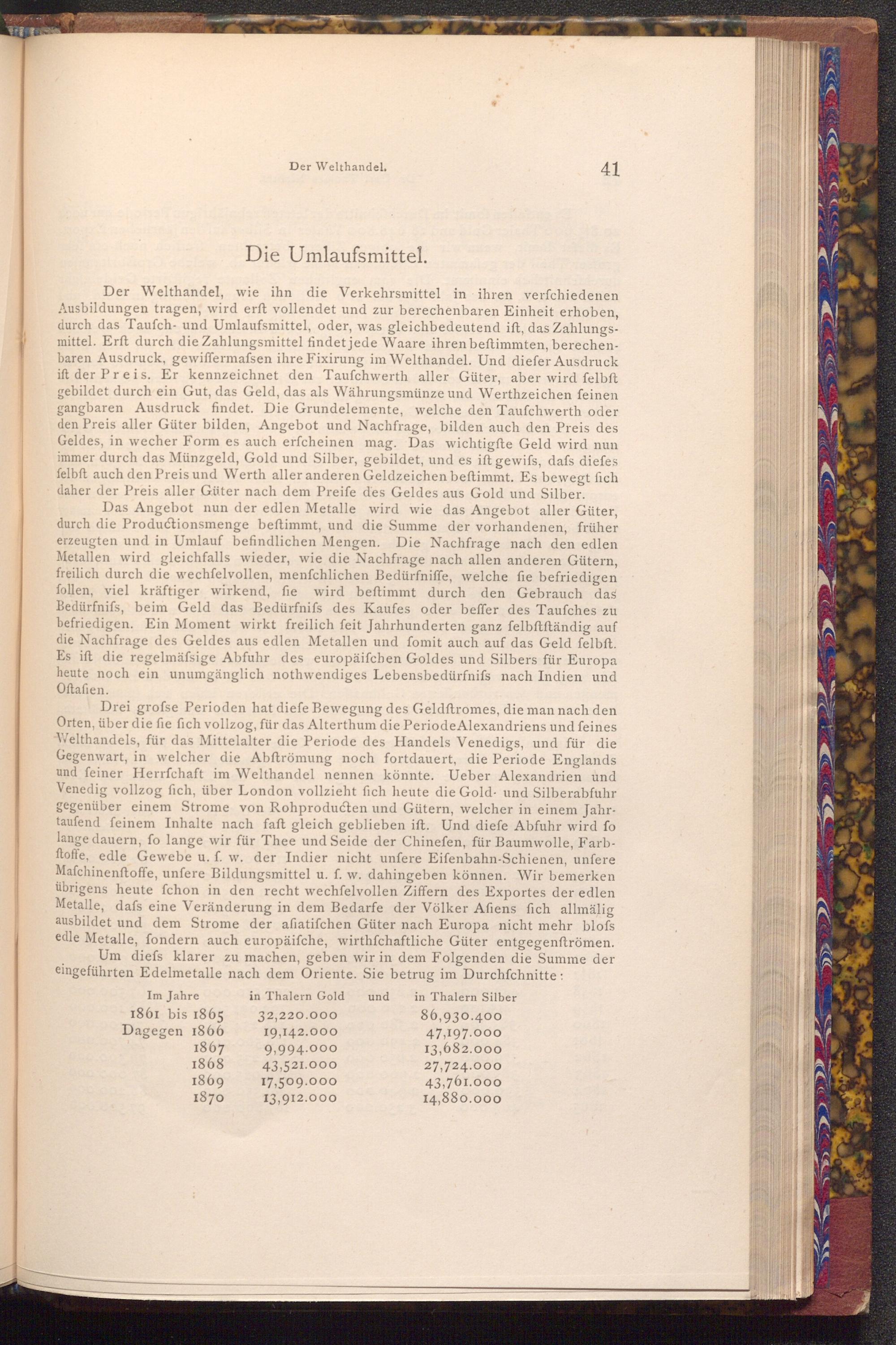 Drei grofse Perioden hat diefe Bewegung des Geldftromes, die man nach den Orten, über die fie fich vollzog, für das Alterthum die Periode Alexandriens und feines Welthandels, für das Mittelalter die Periode des Handels Venedigs, und für die Gegenwart, in welcher die Abftrömung noch fortdauert, die Periode Englands und feiner Herrfchaft im Welthandel nennen könnte. Ueber Alexandrien und Venedig vollzog fich, über London vollzieht fich heute die Gold- und Silberabfuhr gegenüber einem Strome von Rohproducten und Gütern, welcher in einem Jahrtaufend feinem Inhalte nach faft gleich geblieben ift. Und diefe Abfuhr wird fo lange dauern, fo lange wir für Thee und Seide der Chinefen, für Baumwolle, Farbftoffe, edle Gewebe u. f. w. der Indier nicht unfere Eifenbahn- Schienen, unfere Mafchinenftoffe, unfere Bildungsmittel u. f. w. dahingeben können. Wir bemerken übrigens heute fchon in den recht wechfelvollen Ziffern des Exportes der edlen Metalle, dafs eine Veränderung in dem Bedarfe der Völker Afiens fich allmälig ausbildet und dem Strome der afatifchen Güter nach Europa nicht mehr blofs edle Metalle, fondern auch europäiſche, wirthschaftliche Güter entgegenftrömen. Um diefs klarer zu machen, geben wir in dem Folgenden die Summe der eingeführten Edelmetalle nach dem Oriente. Sie betrug im Durchschnitte: