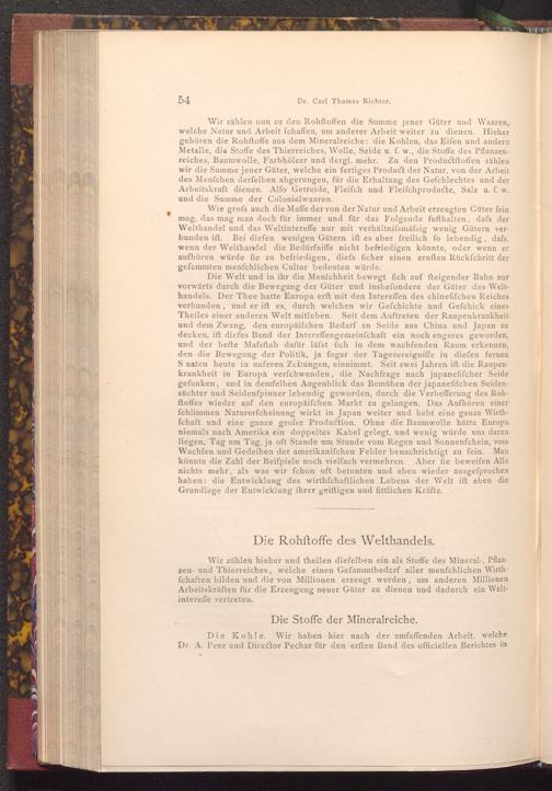 Wie grofs auch die Maffe der von der Natur und Arbeit erzeugten Güter fein mag, das mag man doch für immer und für das Folgende fefthalten, dafs der Welthandel und das Weltintereffe nur mit verhältnifsmäfsig wenig Gütern verbunden ift. Bei diefen wenigen Gütern ift es aber freilich fo lebendig, dafs, wenn der Welthandel die Bedürfniffe nicht befriedigen könnte, oder wenn er aufhören würde fie zu befriedigen, diefs ficher einen ernften Rückfchritt der gefammten menfchlichen Cultur bedeuten würde.