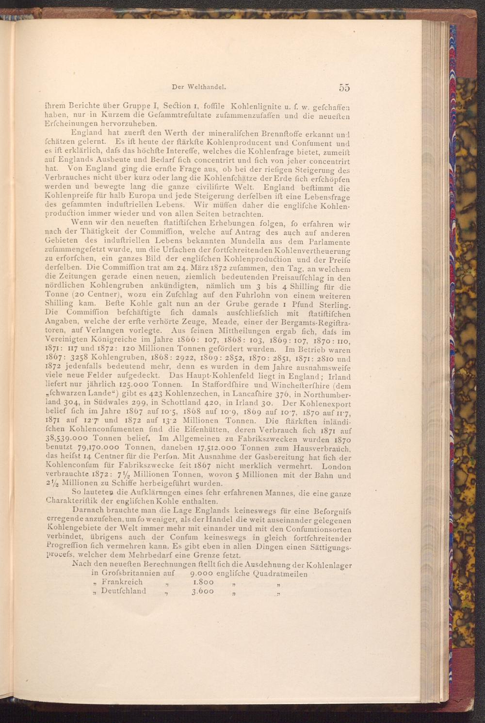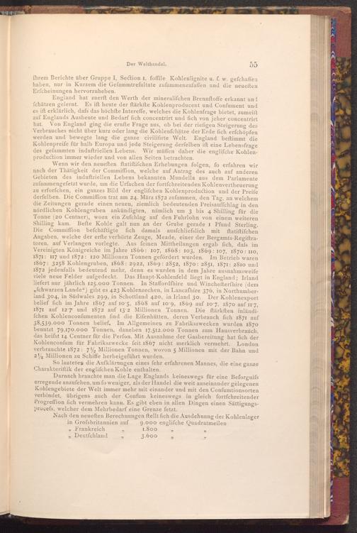 Darnach brauchte man die Lage Englands keineswegs für eine Beforgnifs erregende anzufehen, um fo weniger, als der Handel die weit auseinander gelegenen Kohlengebiete der Welt immer mehr mit einander und mit den Confumtionsorten verbindet, übrigens auch der Confum keineswegs in gleich fortfchreitender Progreffion fich vermehren kann. Es gibt eben in allen Dingen einen Sättigungsprocefs, welcher dem Mehrbedarf eine Grenze fetzt.