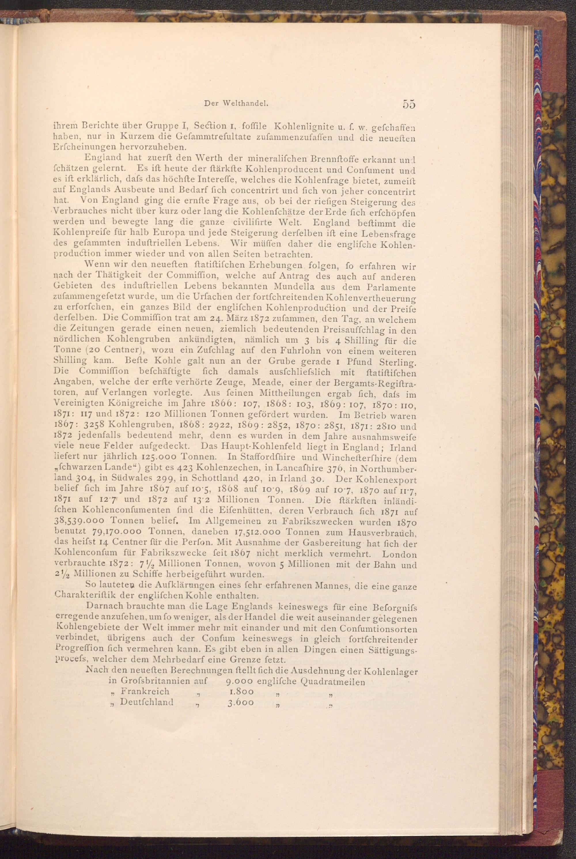 Wenn wir den neueften ftatiftifchen Erhebungen folgen, fo erfahren wir nach der Thätigkeit der Commiffion, welche auf Antrag des auch auf anderen Gebieten des induftriellen Lebens bekannten Mundella aus dem Parlamente zufammengefetzt wurde, um die Urfachen der fortfchreitenden Kohlenvertheuerung zu erforfchen, ein ganzes Bild der englifchen Kohlenproduction und der Preife derfelben. Die Commiffion trat am 24. März 1872 zufammen, den Tag, an welchem die Zeitungen gerade einen neuen, ziemlich bedeutenden Preisauffchlag in den nördlichen Kohlengruben ankündigten, nämlich um 3 bis 4 Shilling für die Tonne( 20 Centner), wozu ein Zufchlag auf den Fuhrlohn von einem weiteren Shilling kam. Befte Kohle galt nun an der Grube gerade I Pfund Sterling. Die Commiffion befchäftigte fich damals ausfchliefslich mit ftatiftifchen Angaben, welche der erfte verhörte Zeuge, Meade, einer der Bergamts- Regiftratoren, auf Verlangen vorlegte. Aus feinen Mittheilungen ergab fich, dafs im Vereinigten Königreiche im Jahre 1866: 107, 1868: 103, 1869: 107, 1870: 110, 1871: 117 und 1872: 120 Millionen Tonnen gefördert wurden. Im Betrieb waren