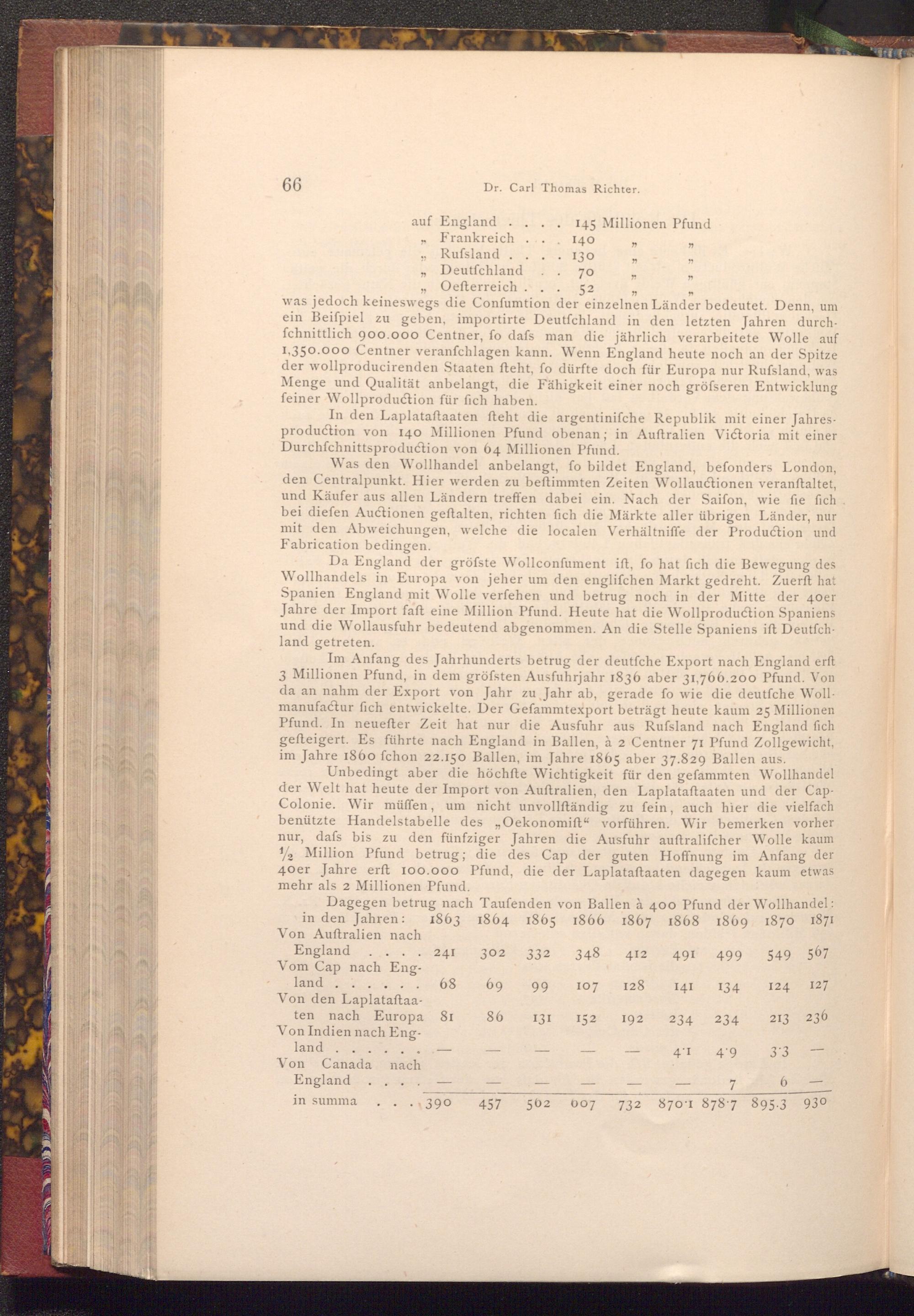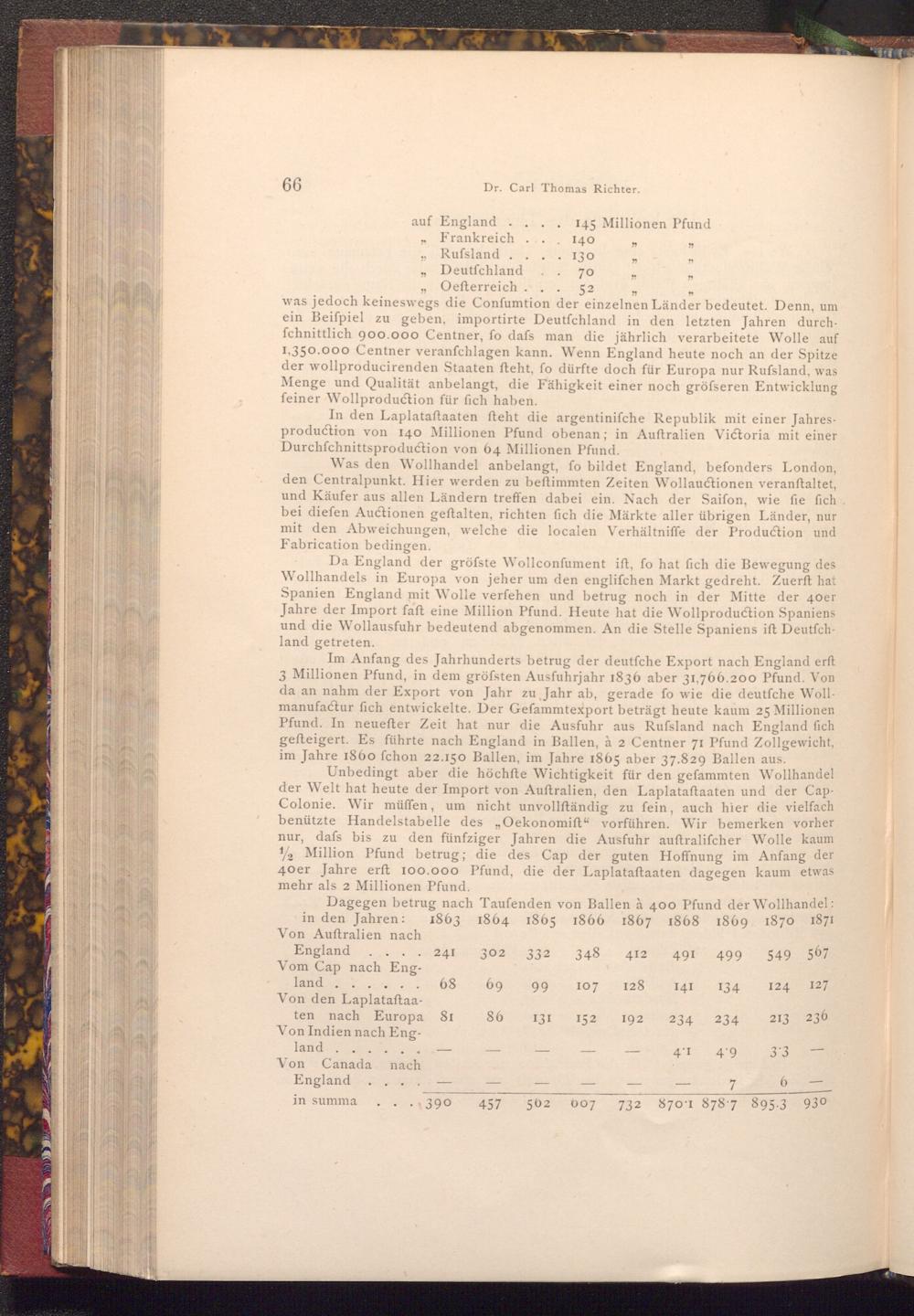 Im Anfang des Jahrhunderts betrug der deutfche Export nach England erft 3 Millionen Pfund, in dem gröfsten Ausfuhrjahr 1836 aber 31,766.200 Pfund. Von da an nahm der Export von Jahr zu Jahr ab, gerade fo wie die deutfche Wollmanufactur fich entwickelte. Der Gefammtexport beträgt heute kaum 25 Millionen Pfund. In neuefter Zeit hat nur die Ausfuhr aus Rufsland nach England fich gefteigert. Es führte nach England in Ballen, à 2 Centner 71 Pfund Zollgewicht, im Jahre 1860 fchon 22.150 Ballen, im Jahre 1865 aber 37.829 Ballen aus.