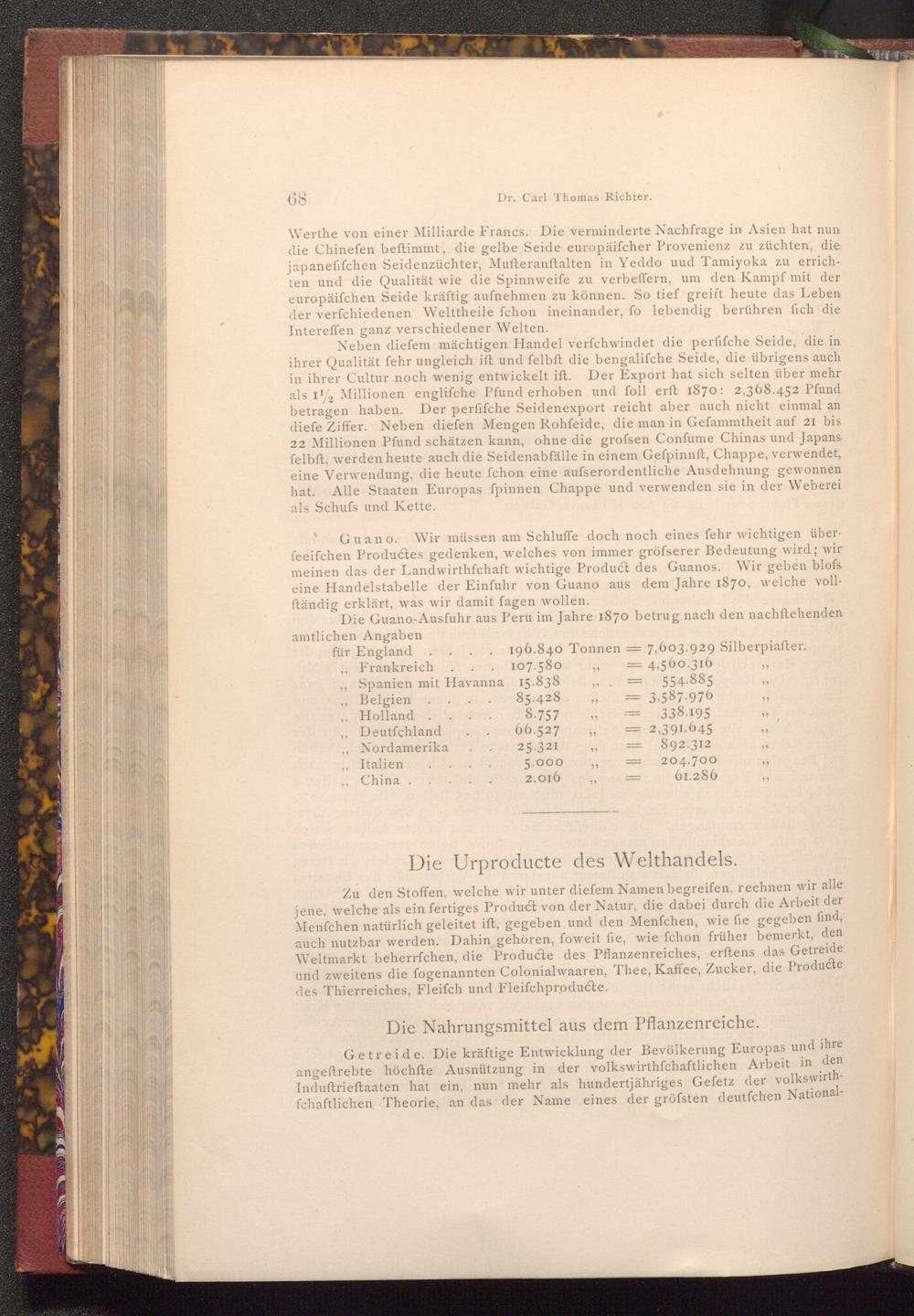 Zu den Stoffen, welche wir unter diefem Namen begreifen, rechnen wir alle jene, welche als ein fertiges Product von der Natur, die dabei durch die Arbeit der Menfchen natürlich geleitet ift, gegeben und den Menfchen, wie fie gegeben find, auch nutzbar werden. Dahin gehören, foweit fie, wie fchon früher bemerkt, den Weltmarkt beherrfchen, die Producte des Pflanzenreiches, erftens das Getreide und zweitens die fogenannten Colonialwaaren, Thee, Kaffee, Zucker, die Producte des Thierreiches, Fleiſch und Fleifchproducte.