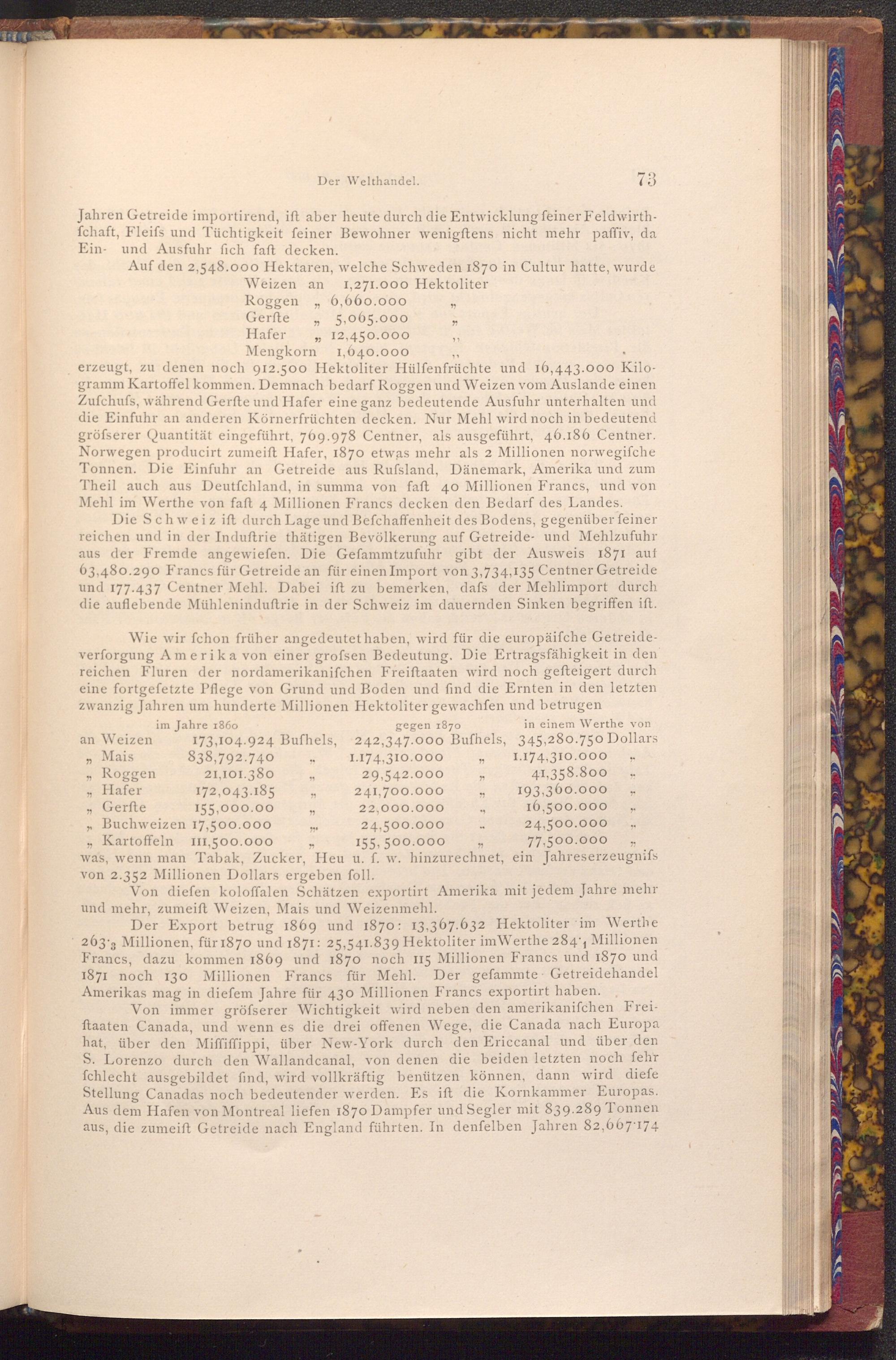 Wie wir fchon früher angedeutet haben, wird für die europäifche Getreideverforgung Amerika von einer grofsen Bedeutung. Die Ertragsfähigkeit in den reichen Fluren der nordamerikanifchen Freiftaaten wird noch gefteigert durch eine fortgefetzte Pflege von Grund und Boden und find die Ernten in den letzten zwanzig Jahren um hunderte Millionen Hektoliter gewachfen und betrugen