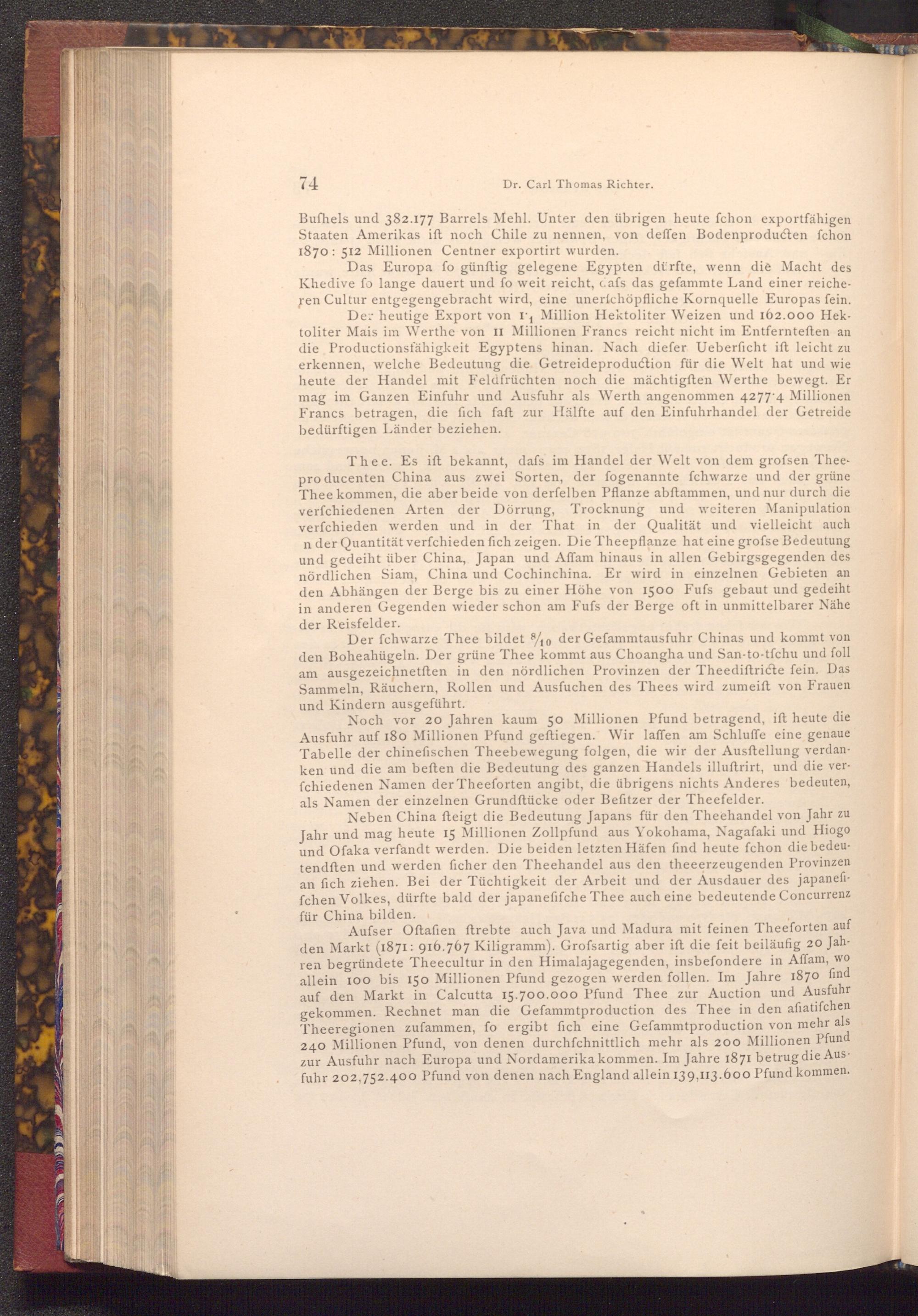 Aufser Oftafien ftrebte auch Java und Madura mit feinen Theeforten auf den Markt( 1871: 916.767 Kiligramm). Grofsartig aber ift die feit beiläufig 20 Jahren begründete Theecultur in den Himalajagegenden, insbefondere in Affam, wo allein 100 bis 150 Millionen Pfund gezogen werden follen. Im Jahre 1870 find auf den Markt in Calcutta 15.700.000 Pfund Thee zur Auction und Ausfuhr gekommen. Rechnet man die Gefammtproduction des Thee in den afiatifchen Theeregionen zufammen, fo ergibt fich eine Gefammtproduction von mehr als 240 Millionen Pfund, von denen durchfchnittlich mehr als 200 Millionen Pfund zur Ausfuhr nach Europa und Nordamerika kommen. Im Jahre 1871 betrug die Ausfuhr 202,752.400 Pfund von denen nach England allein 139,113.600 Pfund kommen.