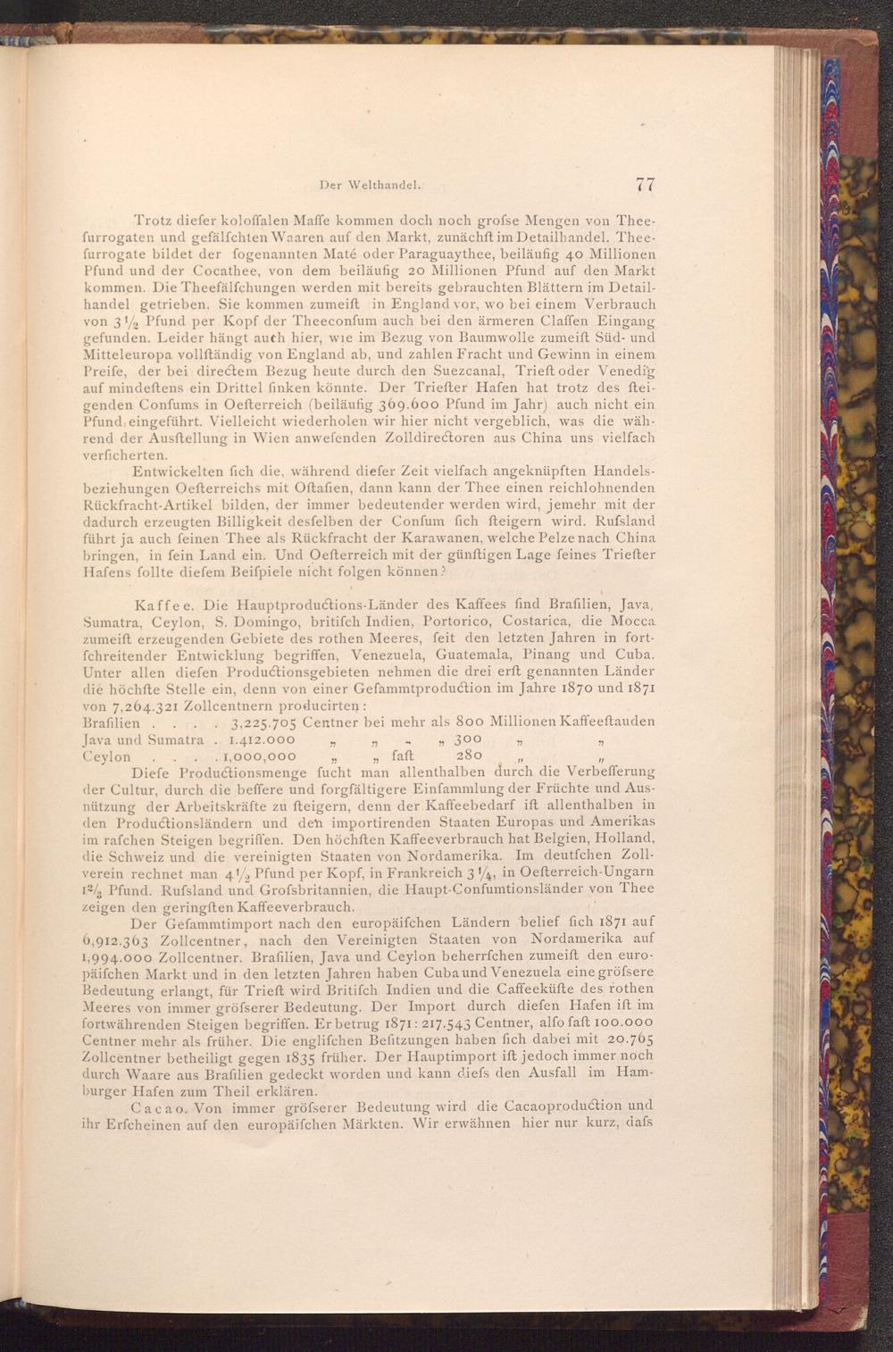 Kaffee. Die Hauptproductions- Länder des Kaffees find Brafilien, Java, Sumatra, Ceylon, S. Domingo, britifch Indien, Portorico, Costarica, die Mocca zumeift erzeugenden Gebiete des rothen Meeres, feit den letzten Jahren in fortfchreitender Entwicklung begriffen, Venezuela, Guatemala, Pinang und Cuba. Unter allen diefen Productionsgebieten nehmen die drei erft genannten Länder die höchfte Stelle ein, denn von einer Gefammtproduction im Jahre 1870 und 1871 von 7,264.321 Zollcentnern producirten: Brafilien 3,225.705 Centner bei mehr als 800 Millionen Kaffeeftauden