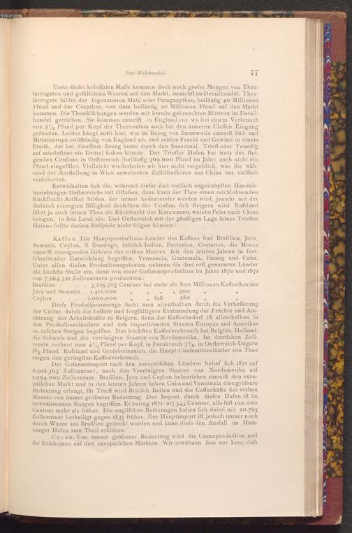 Der Gefammtimport nach den europäiſchen Ländern belief fich 1871 auf 6,912.363 Zollcentner, nach den Vereinigten Staaten von Nordamerika auf 1,994.000 Zollcentner. Brafilien, Java und Ceylon beherrfchen zumeift den europäifchen Markt und in den letzten Jahren haben Cuba und Venezuela eine gröfsere Bedeutung erlangt, für Trieft wird Britifch Indien und die Caffeeküfte des rothen Meeres von immer gröfserer Bedeutung. Der Import durch diefen Hafen iſt im fortwährenden Steigen begriffen. Er betrug 1871: 217.543 Centner, alfo faft 100.000 Centner mehr als früher. Die englifchen Befitzungen haben fich dabei mit 20.765 Zollcentner betheiligt gegen 1835 früher. Der Hauptimport ift jedoch immer noch durch Waare aus Brafilien gedeckt worden und kann diefs den Ausfall im Hamburger Hafen zum Theil erklären.