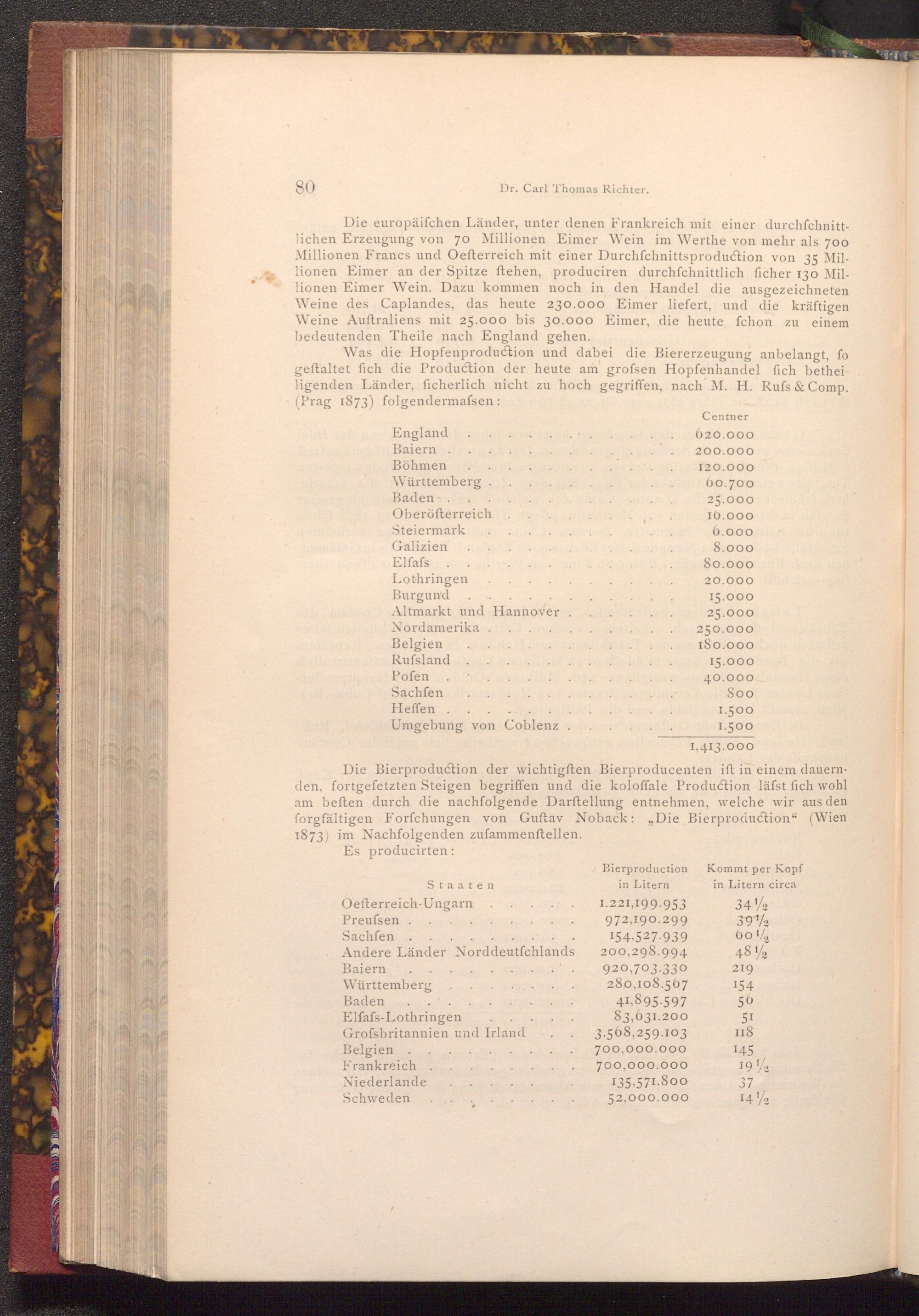 Was die Hopfenproduction und dabei die Biererzeugung anbelangt, fo geftaltet fich die Production der heute am grofsen Hopfenhandel fich betheiligenden Länder, ficherlich nicht zu hoch gegriffen, nach M. H. Rufs& Comp. ( Prag 1873) folgendermassen: