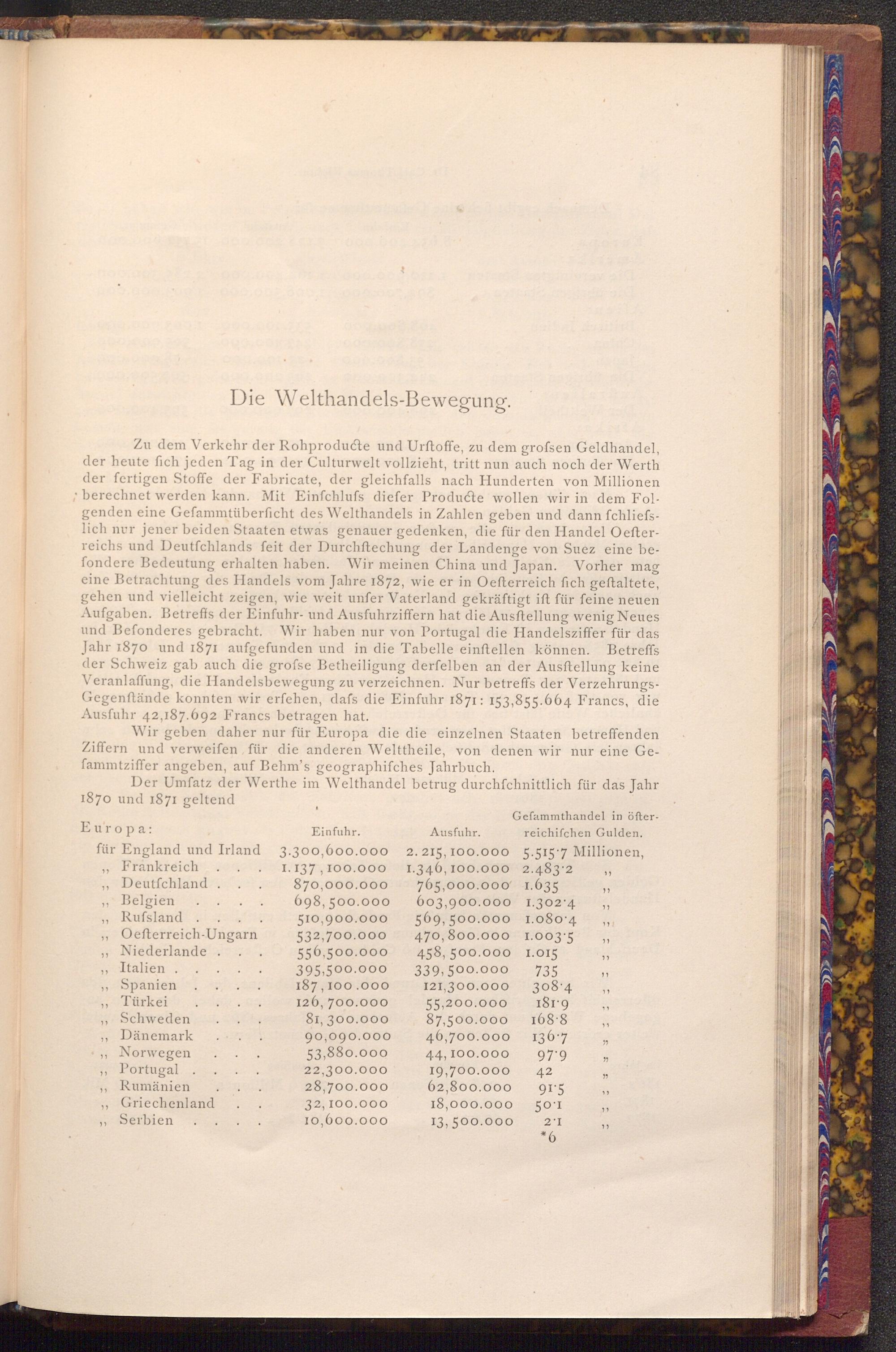Zu dem Verkehr der Rohproducte und Urftoffe, zu dem grofsen Geldhandel, der heute fich jeden Tag in der Culturwelt vollzieht, tritt nun auch noch der Werth der fertigen Stoffe der Fabricate, der gleichfalls nach Hunderten von Millionen berechnet werden kann. Mit Einfchlufs diefer Producte wollen wir in dem Folgenden eine Gefammtüberficht des Welthandels in Zahlen geben und dann fchliefslich nur jener beiden Staaten etwas genauer gedenken, die für den Handel Oefterreichs und Deutfchlands feit der Durchftechung der Landenge von Suez eine befondere Bedeutung erhalten haben. Wir meinen China und Japan. Vorher mag eine Betrachtung des Handels vom Jahre 1872, wie er in Oefterreich fich geftaltete, gehen und vielleicht zeigen, wie weit unfer Vaterland gekräftigt ist für feine neuen Aufgaben. Betreffs der Einfuhr- und Ausfuhrziffern hat die Ausftellung wenig Neues und Befonderes gebracht. Wir haben nur von Portugal die Handelsziffer für das Jahr 1870 und 1871 aufgefunden und in die Tabelle einftellen können. Betreffs der Schweiz gab auch die grofse Betheiligung derfelben an der Ausstellung keine Veranlaffung, die Handelsbewegung zu verzeichnen. Nur betreffs der VerzehrungsGegenftände konnten wir erfehen, dafs die Einfuhr 1871: 153,855.664 Francs, die Ausfuhr 42,187.692 Francs betragen hat.