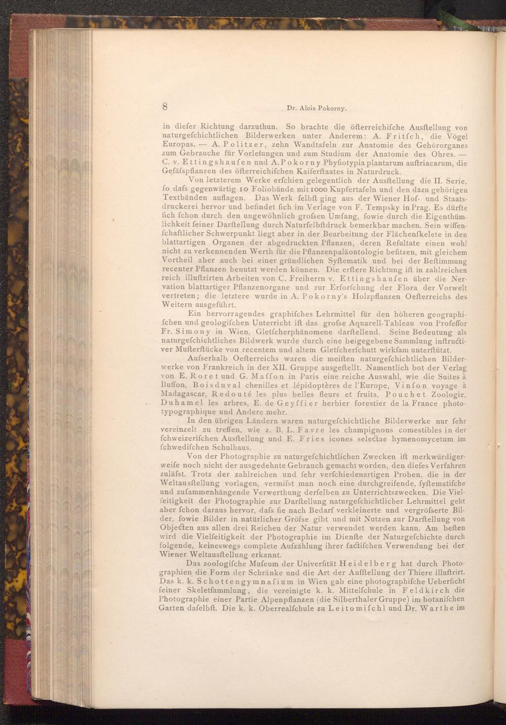 in diefer Richtung darzuthun. So brachte die öfterreichiſche Ausstellung von naturgefchichtlichen Bilderwerken unter Anderem: A. Fritfch, die Vögel Europas. A. Politzer, zehn Wandtafeln zur Anatomie des Gehörorganes zum Gebrauche für Vorlefungen und zum Studium der Anatomie des Ohres. C. v. Ettingshaufen und A. Pokorny Phyfiotypia plantarum auftriacarum, die Gefäfspflanzen des öfterreichifchen Kaiferftaates in Naturdruck.