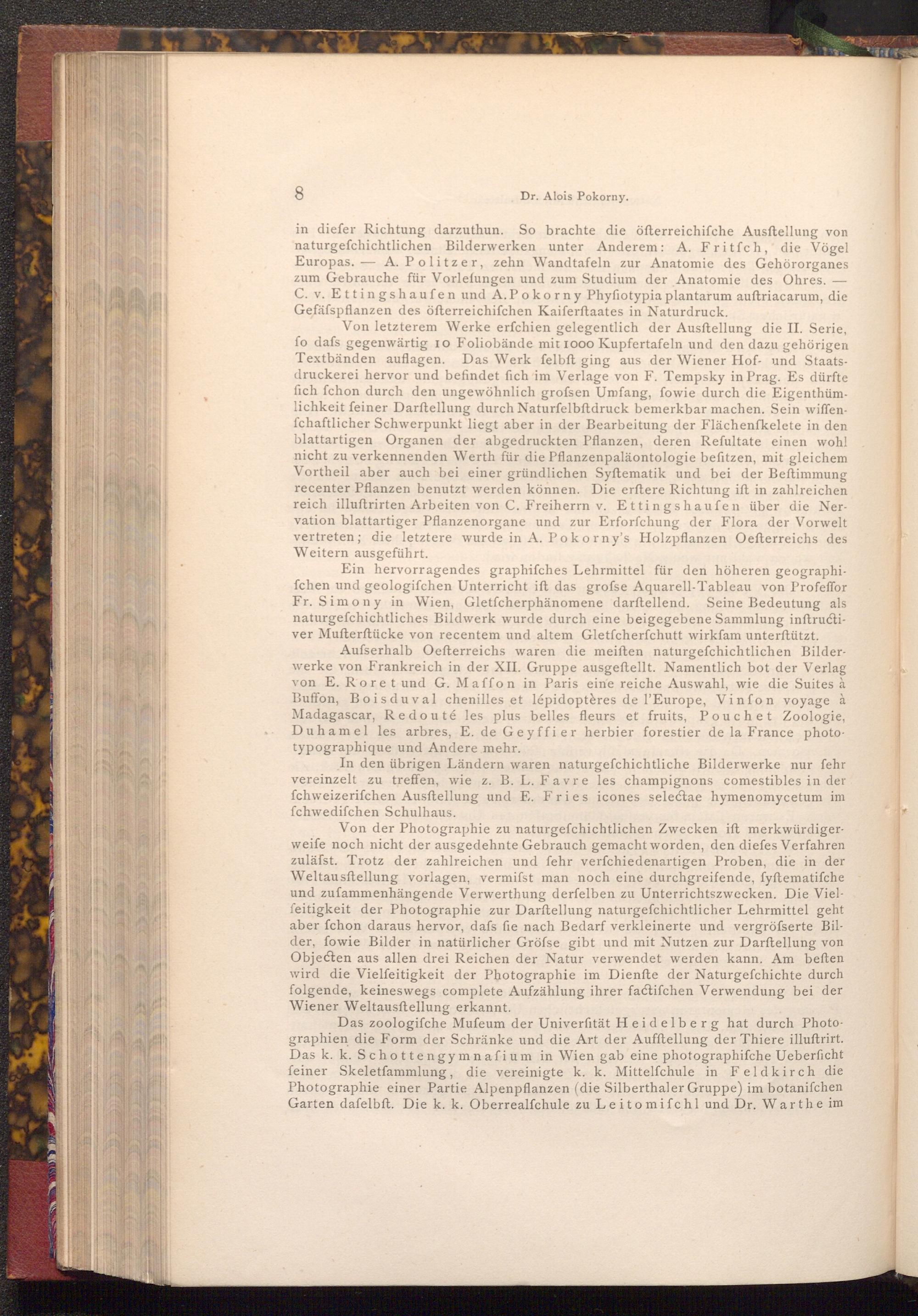 Von letzterem Werke erfchien gelegentlich der Ausftellung die II. Serie, fo dafs gegenwärtig 10 Foliobände mit 1000 Kupfertafeln und den dazu gehörigen Textbänden auflagen. Das Werk felbft ging aus der Wiener Hof- und Staatsdruckerei hervor und befindet fich im Verlage von F. Tempsky in Prag. Es dürfte fich fchon durch den ungewöhnlich grofsen Umfang, fowie durch die Eigenthümlichkeit feiner Darftellung durch Naturfelbftdruck bemerkbar machen. Sein wiffenfchaftlicher Schwerpunkt liegt aber in der Bearbeitung der Flächenfkelete in den blattartigen Organen der abgedruckten Pflanzen, deren Refultate einen wohl nicht zu verkennenden Werth für die Pflanzenpaläontologie befitzen, mit gleichem Vortheil aber auch bei einer gründlichen Syftematik und bei der Beftimmung recenter Pflanzen benutzt werden können. Die erftere Richtung ift in zahlreichen reich illuftrirten Arbeiten von C. Freiherrn v. Ettingshaufen über die Nervation blattartiger Pflanzenorgane und zur Erforschung der Flora der Vorwelt vertreten; die letztere wurde in A. Pokorny's Holzpflanzen Oefterreichs des Weitern ausgeführt.