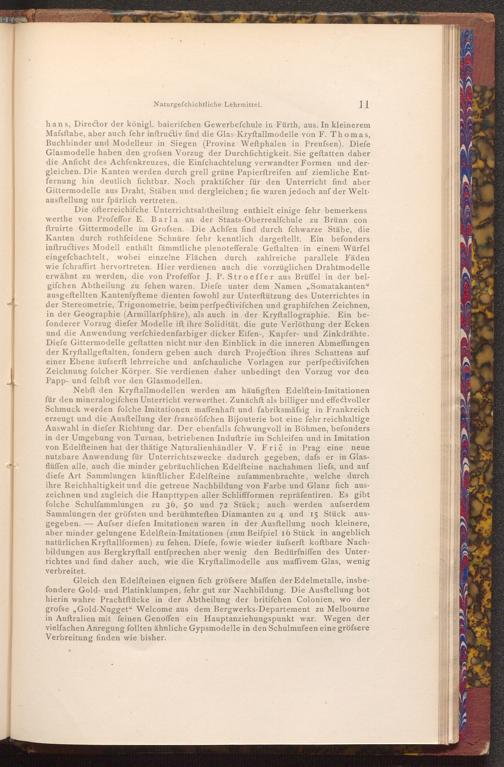 Nebft den Kryftallmodellen werden am häufigften Edelſtein- Imitationen für den mineralogifchen Unterricht verwerthet. Zunächft als billiger und effectvoller Schmuck werden folche Imitationen maffenhaft und fabriksmäfsig in Frankreich erzeugt und die Ausftellung der franzöfifchen Bijouterie bot eine fehr reichhaltige Auswahl in diefer Richtung dar. Der ebenfalls fchwungvoll in Böhmen, befonders in der Umgebung von Turnau, betriebenen Induftrie im Schleifen und in Imitation von Edelſteinen hat der thätige Naturalienhändler V. Frič in Prag eine neue nutzbare Anwendung für Unterrichtszwecke dadurch gegeben, dafs er in Glasflüffen alle, auch die minder gebräuchlichen Edelſteine nachahmen liefs, und auf diefe Art Sammlungen künftlicher Edelſteine zufammenbrachte, welche durch ihre Reichhaltigkeit und die getreue Nachbildung von Farbe und Glanz fich auszeichnen und zugleich die Haupttypen aller Schliffformen repräfentiren. Es gibt folche Schulfammlungen zu 36, 50 und 72 Stück; auch werden aufserdem Sammlungen der gröfsten und berühmteften Diamanten zu 4 und 15 Stück ausgegeben. Aufser diefen Imitationen waren in der Ausftellung noch kleinere, aber minder gelungene Edelſtein- Imitationen( zum Beiſpiel 16 Stück in angeblich natürlichen Kryftallformen) zu fehen. Diefe, fowie wieder äufserft koftbare Nachbildungen aus Bergkryftall entſprechen aber wenig den Bedürfniffen des Unterrichtes und find daher auch, wie die Kryftallmodelle aus maffivem Glas, wenig verbreitet.