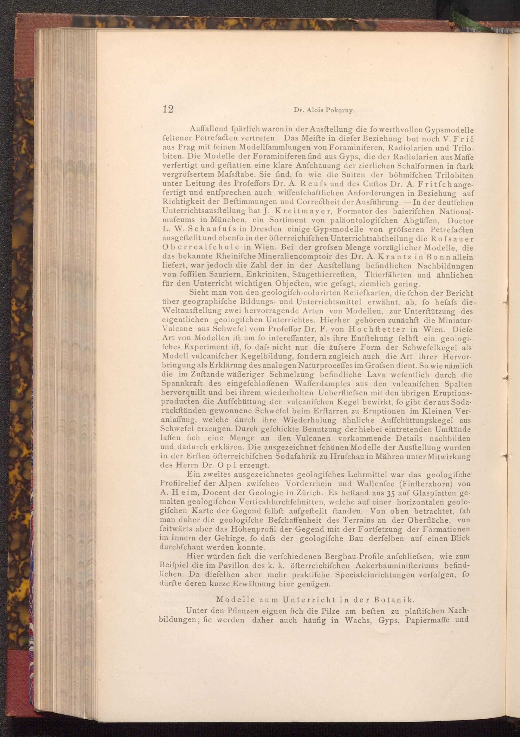 Auffallend fpärlich waren in der Ausftellung die fo werthvollen Gypsmodelle feltener Petrefacten vertreten. Das Meifte in diefer Beziehung bot noch V. Frič aus Prag mit feinen Modellfammlungen von Foraminiferen, Radiolarien und Trilobiten. Die Modelle der Foraminiferen find aus Gyps, die der Radiolarien aus Maffe verfertigt und geftatten eine klare Anfchauung der zierlichen Schalformen in ſtark vergrössertem Mafsftabe. Sie find, fo wie die Suiten der böhmifchen Trilobiten unter Leitung des Profeffors Dr. A. Reufs und des Cuftos Dr. A. Fritfchangefertigt und entſprechen auch wiffenfchaftlichen Anforderungen in Beziehung auf Richtigkeit der Beftimmungen und Correctheit der Ausführung.- In der deutfchen Unterrichtsausftellung hat J. Kreitmayer, Formator des baierifchen Nationalmufeums in München, ein Sortiment von paläontologifchen Abgüffen, Doctor L. W. Schaufufs in Dresden einige Gypsmodelle von gröfseren Petrefacten ausgeftellt und ebenfo in der öfterreichifchen Unterrichtsabtheilung die Rofsauer Oberrealfchule in Wien. Bei der grofsen Menge vorzüglicher Modelle, die das bekannte Rheinifche Mineralien comptoir des Dr. A. Krantz in Bonn allein liefert, war jedoch die Zahl der in der Ausftellung befindlichen Nachbildungen von foffilen Sauriern, Enkriniten, Säugethierreften, Thierfährten und ähnlichen für den Unterricht wichtigen Objecten, wie gefagt, ziemlich gering.