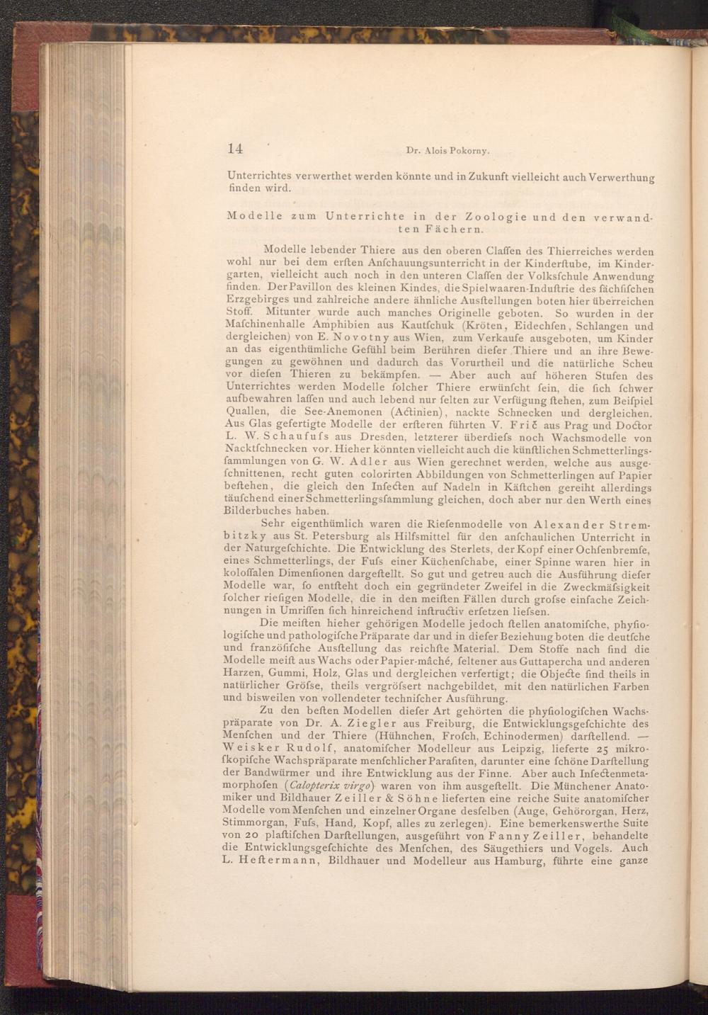 Zu den beften Modellen diefer Art gehörten die phyfiologifchen Wachspräparate von Dr. A. Ziegler aus Freiburg, die Entwicklungsgefchichte des Menfchen und der Thiere( Hühnchen, Frofch, Echinodermen) darftellend. Weisker Rudolf, anatomifcher Modelleur aus Leipzig, lieferte 25 mikrofkopifche Wachspräparate menfchlicher Parafiten, darunter eine fchöne Darftellung der Bandwürmer und ihre Entwicklung aus der Finne. Aber auch Infectenmetamorphofen( Calopterix virgo) waren von ihm ausgeftellt. Die Münchener Anatomiker und Bildhauer Zeiller& Söhne lieferten eine reiche Suite anatomifcher Modelle vom Menfchen und einzelner Organe desfelben( Auge, Gehörorgan, Herz, Stimmorgan, Fufs, Hand, Kopf, alles zu zerlegen). Eine bemerkenswerthe Suite von 20 plaftifchen Darftellungen, ausgeführt von Fanny Zeiller, behandelte die Entwicklungsgefchichte des Menfchen, des Säugethiers und Vogels. Auch L. Heftermann, Bildhauer und Modelleur aus Hamburg, führte eine ganze