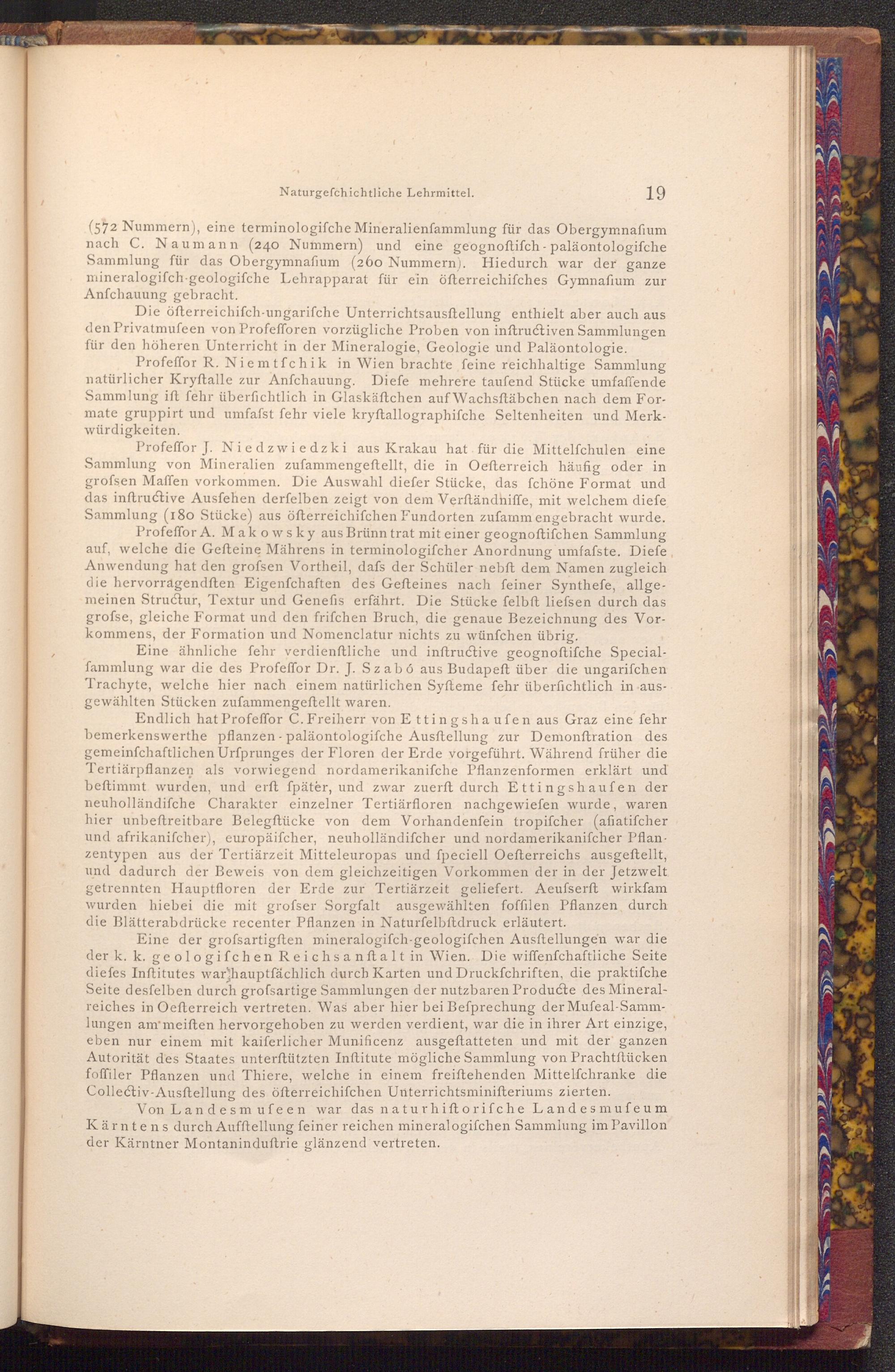 Die öfterreichifch- ungarifche Unterrichtsausftellung enthielt aber auch aus den Privatmufeen von Profefforen vorzügliche Proben von inftructiven Sammlungen für den höheren Unterricht in der Mineralogie, Geologie und Paläontologie.