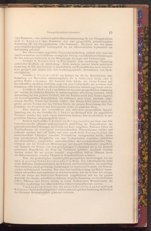 Profeffor J. Niedzwiedzki aus Krakau hat für die Mittelfchulen eine Sammlung von Mineralien zufammengeftellt, die in Oefterreich häufig oder in grofsen Maffen vorkommen. Die Auswahl diefer Stücke, das fchöne Format und das inftructive Ausfehen derfelben zeigt von dem Verftändniffe, mit welchem diefe Sammlung( 180 Stücke) aus öfterreichifchen Fundorten zufamm engebracht wurde.
