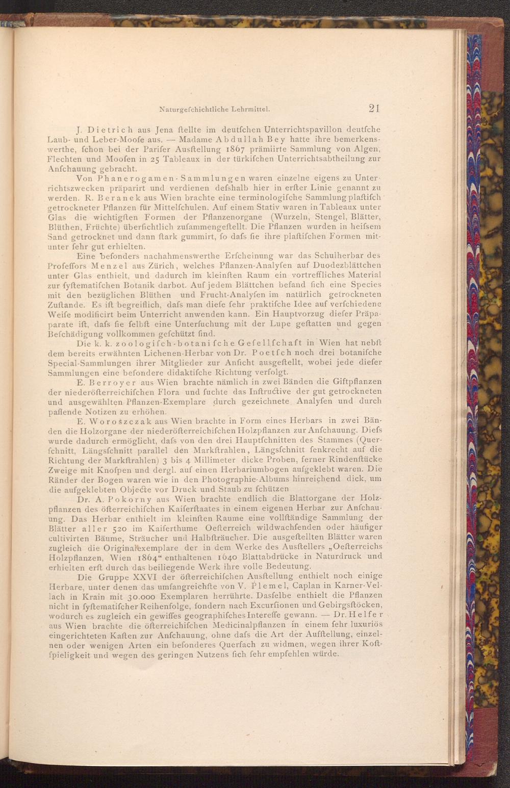 E. Woroszczak aus Wien brachte in Form eines Herbars in zwei Bänden die Holzorgane der niederöfterreichifchen Holzpflanzen zur Anfchauung. Diefs wurde dadurch ermöglicht, dafs von den drei Hauptfchnitten des Stammes( Querfchnitt, Längsfchnitt parallel den Markftrahlen, Längsfchnitt fenkrecht auf die Richtung der Markftrahlen) 3 bis 4 Millimeter dicke Proben, ferner Rindenftücke Zweige mit Knofpen und dergl. auf einen Herbariumbogen aufgeklebt waren. Die Ränder der Bogen waren wie in den Photographie- Albums hinreichend dick, um die aufgeklebten Objecte vor Druck und Staub zu fchützen