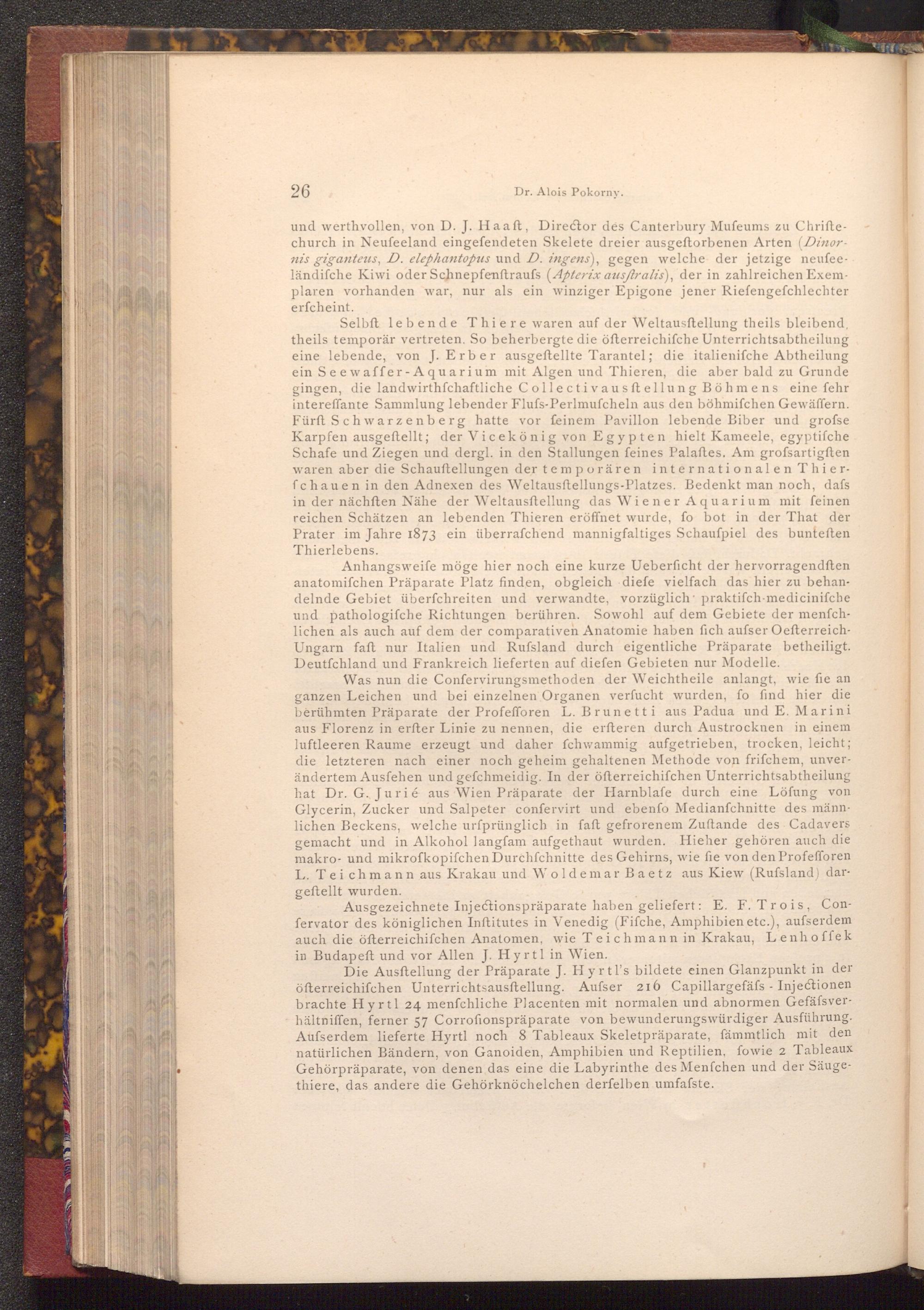 Die Ausftellung der Präparate J. Hyrtl's bildete einen Glanzpunkt in der öfterreichifchen Unterrichtsausftellung. Aufser 216 Capillargefäfs Injectionen brachte Hyrtl 24 menfchliche Placenten mit normalen und abnormen Gefäfsverhältniffen, ferner 57 Corroſionspräparate von bewunderungswürdiger Ausführung. Aufserdem lieferte Hyrtl noch 8 Tableaux Skeletpräparate, fämmtlich mit den natürlichen Bändern, von Ganoiden, Amphibien und Reptilien, fowie 2 Tableaux Gehörpräparate, von denen das eine die Labyrinthe des Menfchen und der Säugethiere, das andere die Gehörknöchelchen derfelben umfafste.