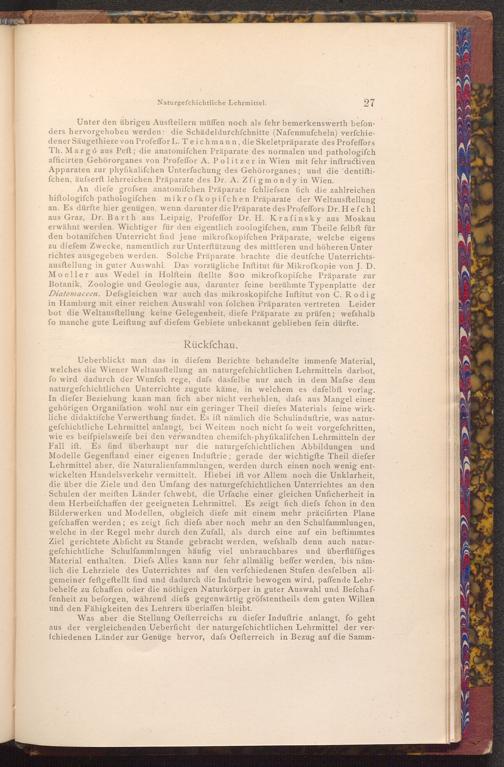 An diefe grofsen anatomifchen Präparate fchliefsen fich die zahlreichen hiftologifch pathologiſchen mikrofkopifchen Präparate der Weltausstellung an. Es dürfte hier genügen, wenn darunter die Präparate des Profeffors Dr. Hefchl aus Graz, Dr. Barth aus Leipzig, Profeffor Dr. H. Krafinsky aus Moskau erwähnt werden. Wichtiger für den eigentlich zoologifchen, zum Theile felbft für den botanifchen Unterricht find jene mikrofkopifchen Präparate, welche eigens zu diefem Zwecke, namentlich zur Unterftützung des mittleren und höheren Unter richtes ausgegeben werden. Solche Präparate brachte die deutfche Unterrichtsausftellung in guter Auswahl. Das vorzügliche Inftitut für Mikrofkopie von J. D. Moeller aus Wedel in Holftein ftellte 800 mikrofkopifche Präparate zur Botanik, Zoologie und Geologie aus, darunter feine berühmte Typenplatte der Diatomaceen. Defsgleichen war auch das mikroskopifche Inftitut von C. Rodig in Hamburg mit einer reichen Auswahl von folchen Präparaten vertreten Leider bot die Weltausftellung keine Gelegenheit, diefe Präparate zu prüfen; wefshalb fo manche gute Leiftung auf diefem Gebiete unbekannt geblieben fein dürfte.