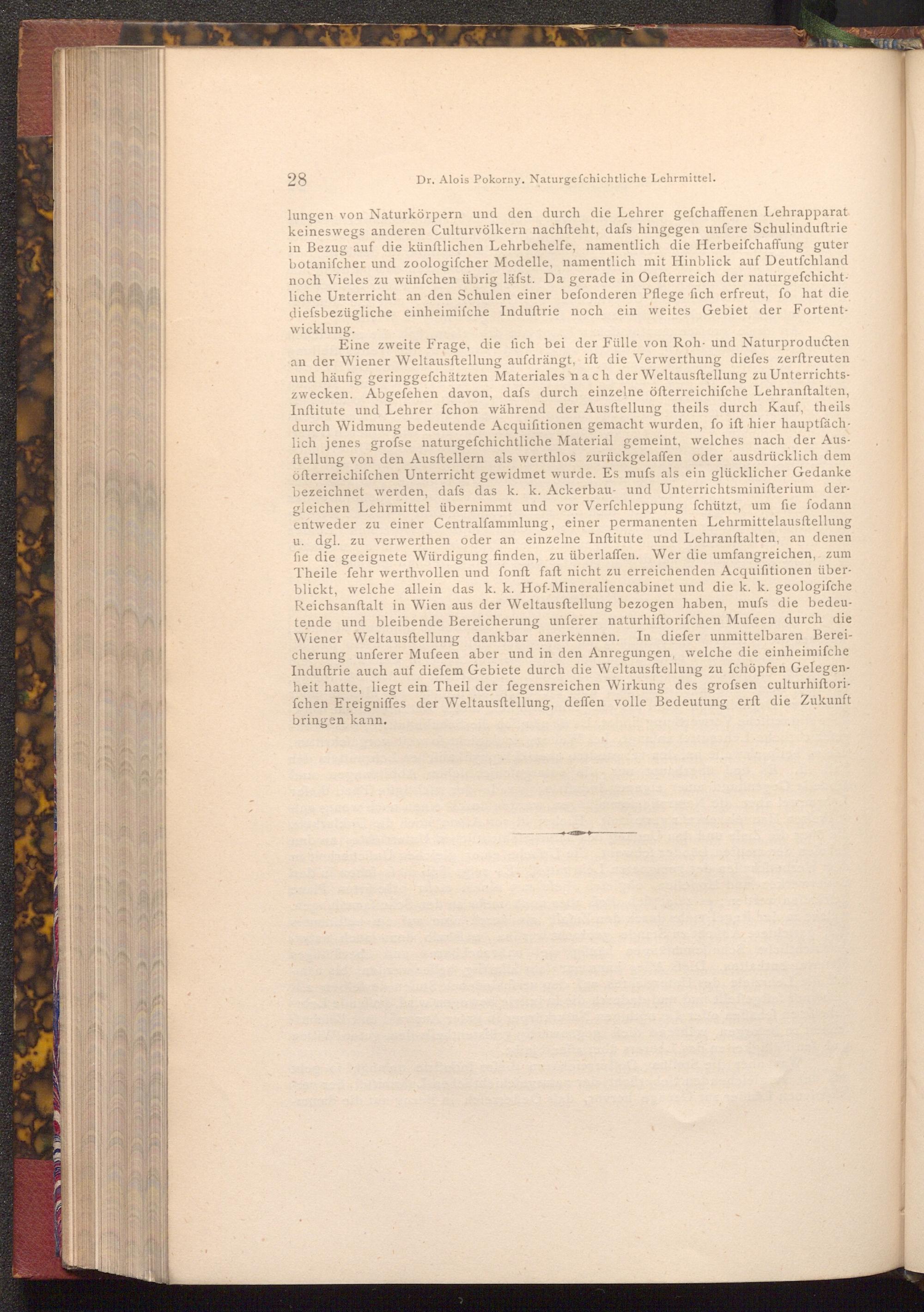 Eine zweite Frage, die fich bei der Fülle von Roh- und Naturproducten an der Wiener Weltausftellung aufdrängt, ift die Verwerthung diefes zerftreuten und häufig geringgefchätzten Materiales nach der Weltausftellung zu Unterrichtszwecken. Abgefehen davon, dafs durch einzelne öfterreichifche Lehranstalten, Inftitute und Lehrer fchon während der Ausftellung theils durch Kauf, theils durch Widmung bedeutende Acquifitionen gemacht wurden, fo ift hier hauptfächlich jenes grofse naturgefchichtliche Material gemeint, welches nach der Ausftellung von den Ausftellern als werthlos zurückgelaffen oder ausdrücklich dem öfterreichifchen Unterricht gewidmet wurde. Es mufs als ein glücklicher Gedanke bezeichnet werden, dafs das k. k. Ackerbau- und Unterrichtsminifterium dergleichen Lehrmittel übernimmt und vor Verfchleppung fchützt, um fie fodann entweder zu einer Centralfammlung, einer permanenten Lehrmittelausstellung u. dgl. zu verwerthen oder an einzelne Inftitute und Lehranstalten, an denen fie die geeignete Würdigung finden, zu überlaffen. Wer die umfangreichen, zum Theile fehr werthvollen und fonft faft nicht zu erreichenden Acquifitionen überblickt, welche allein das k. k. Hof- Mineralien cabinet und die k. k. geologifche Reichsanftalt in Wien aus der Weltausftellung bezogen haben, mufs die bedeutende und bleibende Bereicherung unferer naturhiftorifchen Mufeen durch die Wiener Weltausftellung dankbar anerkennen. In diefer unmittelbaren Bereicherung unferer Muſeen aber und in den Anregungen, welche die einheimifche Induftrie auch auf diefem Gebiete durch die Weltausftellung zu fchöpfen Gelegenheit hatte, liegt ein Theil der fegensreichen Wirkung des grofsen culturhiftorifchen Ereigniffes der Weltausftellung, deffen volle Bedeutung erft die Zukunft bringen kann.