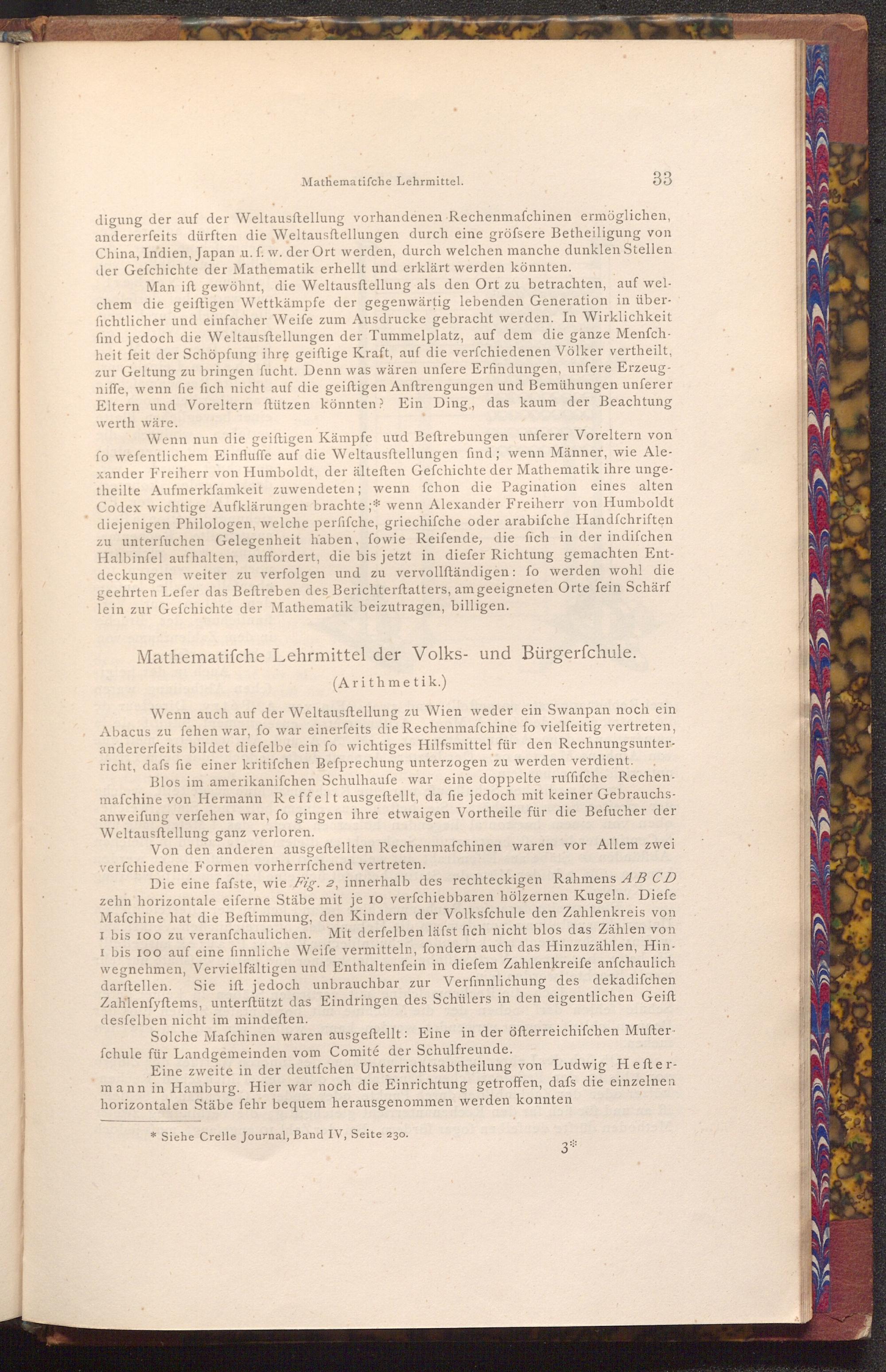 Wenn nun die geiftigen Kämpfe uud Beftrebungen unferer Voreltern von fo wefentlichem Einfluffe auf die Weltausstellungen find; wenn Männer, wie Alexander Freiherr von Humboldt, der älteften Gefchichte der Mathematik ihre ungetheilte Aufmerkfamkeit zuwendeten; wenn fchon die Pagination eines alten Codex wichtige Aufklärungen brachte; wenn Alexander Freiherr von Humboldt diejenigen Philologen, welche perfifche, griechifche oder arabifche Handfchriften zu unterfuchen Gelegenheit haben, fowie Reifende, die fich in der indifchen Halbinfel aufhalten, auffordert, die bis jetzt in diefer Richtung gemachten Entdeckungen weiter zu verfolgen und zu vervollſtändigen: fo werden wohl die geehrten Lefer das Beftreben des Berichterstatters, am geeigneten Orte fein Schärf lein zur Gefchichte der Mathematik beizutragen, billigen.