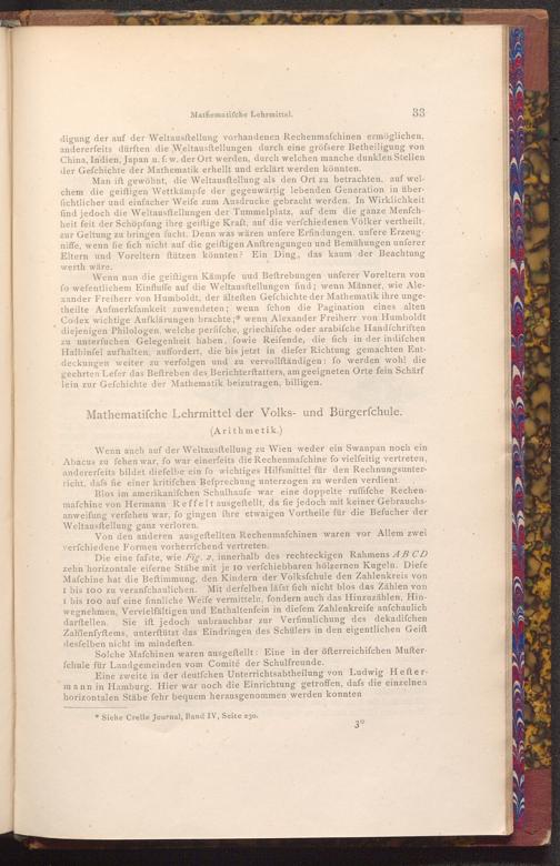 digung der auf der Weltausftellung vorhandenen Rechenmaschinen ermöglichen, andererfeits dürften die Weltausftellungen durch eine gröfsere Betheiligung von China, Indien, Japan u. f. w. der Ort werden, durch welchen manche dunklen Stellen der Gefchichte der Mathematik erhellt und erklärt werden könnten.