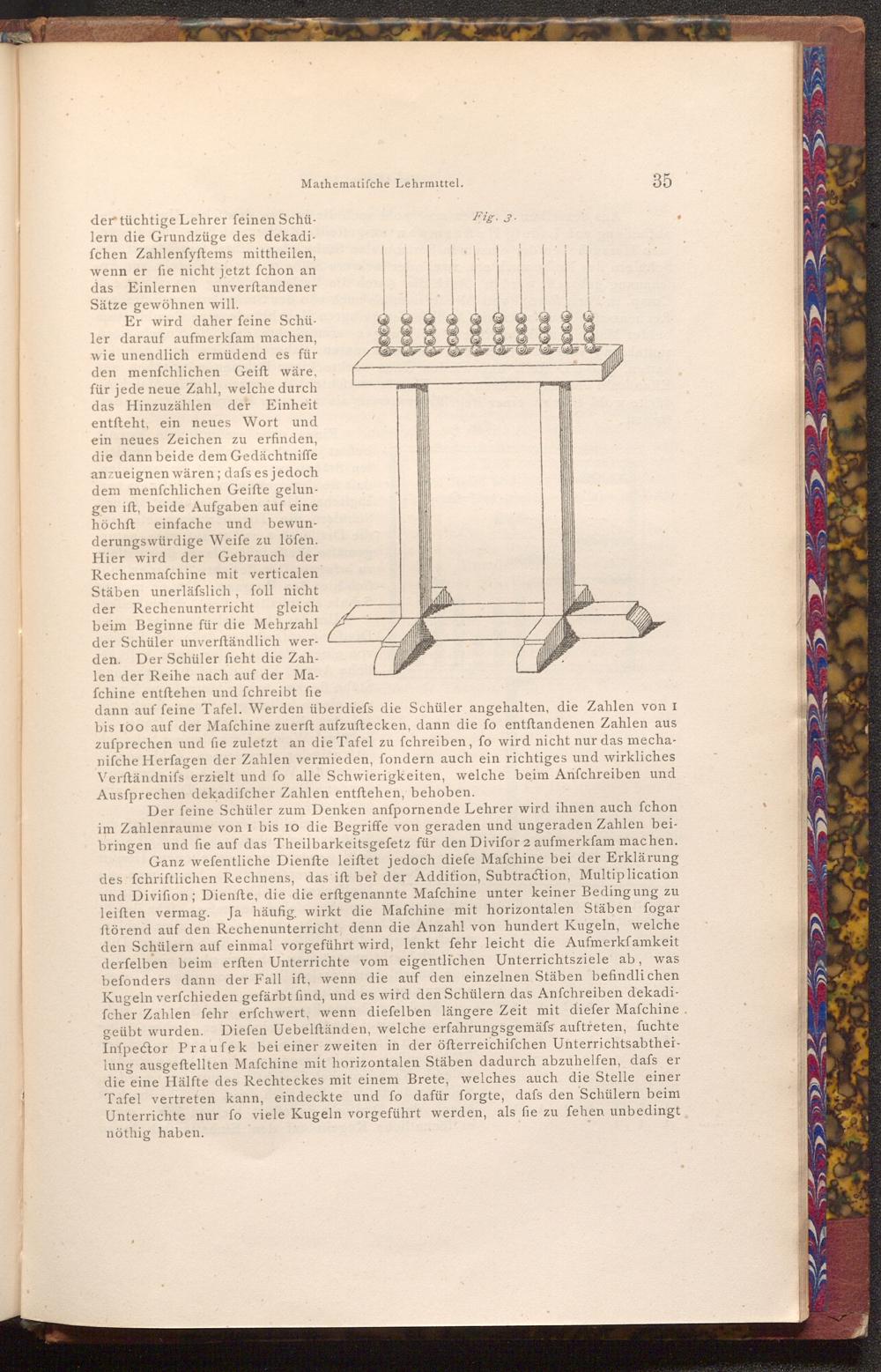 Ganz wefentliche Dienfte leiftet jedoch diefe Mafchine bei der Erklärung des fchriftlichen Rechnens, das ift bei der Addition, Subtraction, Multiplication und Divifion; Dienfte, die die erftgenannte Mafchine unter keiner Bedingung zu leiften vermag. Ja häufig. wirkt die Maſchine mit horizontalen Stäben fogar ftörend auf den Rechenunterricht, denn die Anzahl von hundert Kugeln, welche den Schülern auf einmal vorgeführt wird, lenkt fehr leicht die Aufmerksamkeit derfelben beim erften Unterrichte vom eigentlichen Unterrichtsziele ab, was befonders dann der Fall ift, wenn die auf den einzelnen Stäben befindlichen Kugeln verfchieden gefärbt find, und es wird den Schülern das Anfchreiben dekadifcher Zahlen fehr erfchwert, wenn diefelben längere Zeit mit diefer Mafchine. geübt wurden. Diefen Uebelftänden, welche erfahrungsgemäfs auftreten, fuchte Infpector Praufek bei einer zweiten in der öfterreichifchen Unterrichtsabtheilung ausgeftellten Mafchine mit horizontalen Stäben dadurch abzuhelfen, dafs er die eine Hälfte des Rechteckes mit einem Brete, welches auch die Stelle einer Tafel vertreten kann, eindeckte und fo dafür forgte, dafs den Schülern beim Unterrichte nur fo viele Kugeln vorgeführt werden, als fie zu fehen unbedingt nöthig haben.