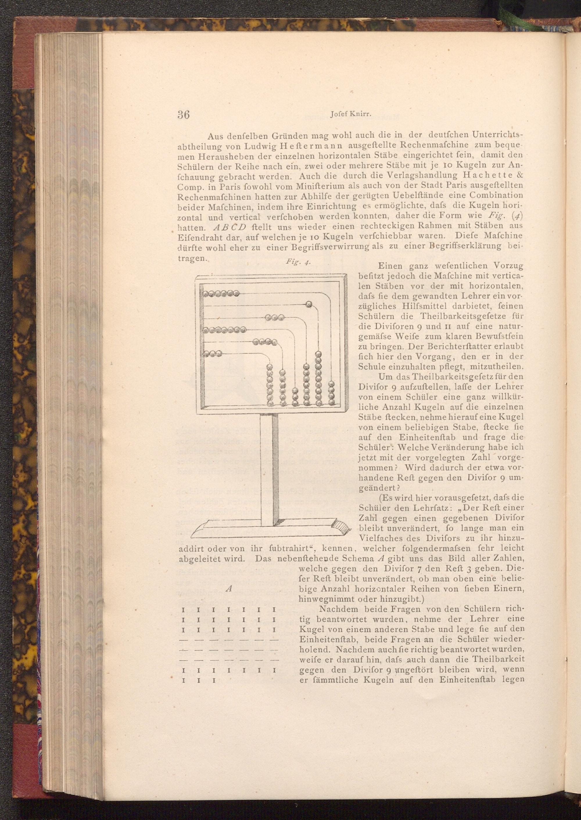 Einen ganz wefentlichen Vorzug befitzt jedoch die Mafchine mit verticalen Stäben vor der mit horizontalen, dafs fie dem gewandten Lehrer ein vor zügliches Hilfsmittel darbietet, feinen Schülern die Theilbarkeitsgefetze für die Diviforen 9 und II auf eine naturgemäfse Weife zum klaren Bewufstfein zu bringen. Der Berichterstatter erlaubt fich hier den Vorgang, den er in der Schule einzuhalten pflegt, mitzutheilen.