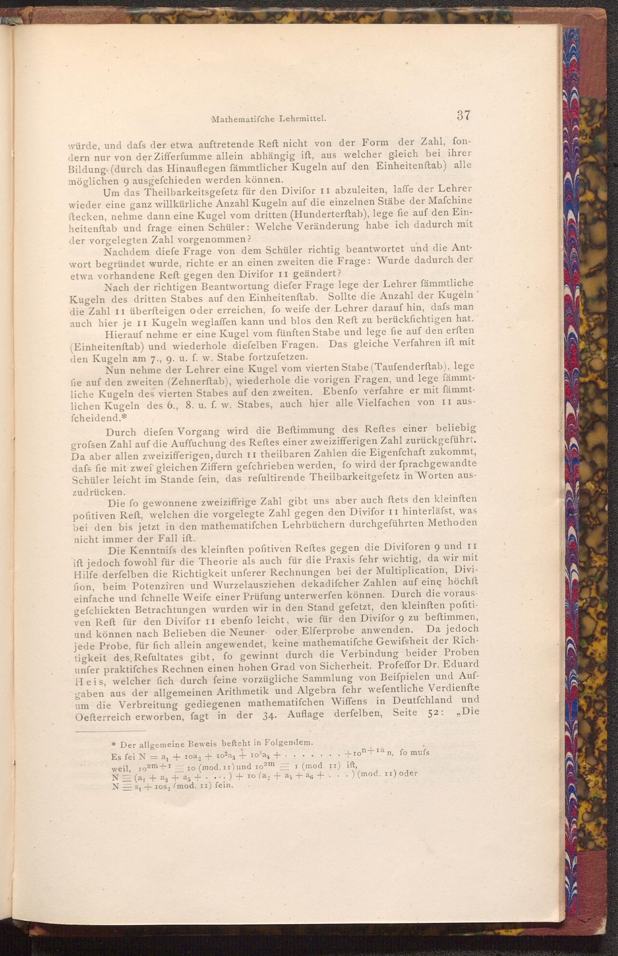 Die Kenntnifs des kleinften pofitiven Reftes gegen die Diviforen 9 und II ift jedoch fowohl für die Theorie als auch für die Praxis fehr wichtig, da wir mit Hilfe derfelben die Richtigkeit unferer Rechnungen bei der Multiplication, Divifion, beim Potenziren und Wurzelausziehen dekadifcher Zahlen auf eine höchft einfache und fchnelle Weife einer Prüfung unterwerfen können. Durch die vorausgefchickten Betrachtungen wurden wir in den Stand gefetzt, den kleinften pofitiven Reft für den Divifor II ebenfo leicht, wie für den Divifor 9 zu beftimmen, und können nach Belieben die Neuner oder Elferprobe anwenden. Da jedoch jede Probe, für fich allein angewendet, keine mathematiſche Gewifsheit der Richtigkeit des Refultates gibt, fo gewinnt durch die Verbindung beider Proben unfer praktifches Rechnen einen hohen Grad von Sicherheit. Profeffor Dr. Eduard Heis, welcher fich durch feine vorzügliche Sammlung von Beiſpielen und Aufgaben aus der allgemeinen Arithmetik und Algebra fehr wefentliche Verdienfte um die Verbreitung gediegenen mathematiſchen Wiffens in Deutſchland und Oefterreich erworben, fagt in der 34. Auflage derfelben, Seite 52:„ Die