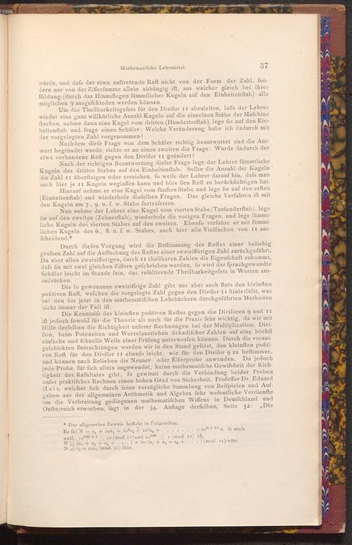 Durch diefen Vorgang wird die Beftimmung des Reftes einer beliebig grofsen Zahl auf die Auffuchung des Reftes einer zweizifferigen Zahl zurückgeführt. Da aber allen zweizifferigen, durch II theilbaren Zahlen die Eigenfchaft zukommt, dafs fie mit zwei gleichen Ziffern gefchrieben werden, fo wird der fprachgewandte Schüler leicht im Stande fein, das refultirende Theilbarkeitgefetz in Worten auszudrücken.