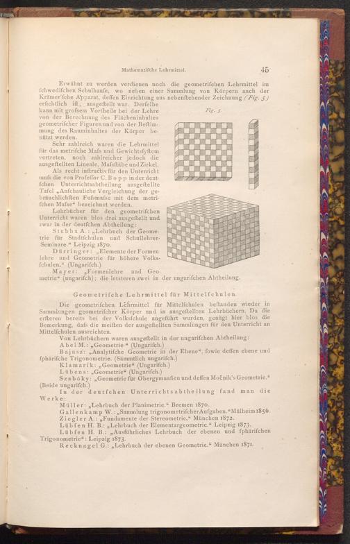 Die geometrifchen Lehrmittel für Mittelfchulen beftanden wieder in Sammlungen geometrifcher Körper und in ausgeftellten Lehrbüchern. Da die erfteren bereits bei der Volksfchule angeführt wurden, genügt hier blos die Bemerkung, dafs die meiſten der ausgeftellten Sammlungen für den Unterricht an Mittelfchulen ausreichten.