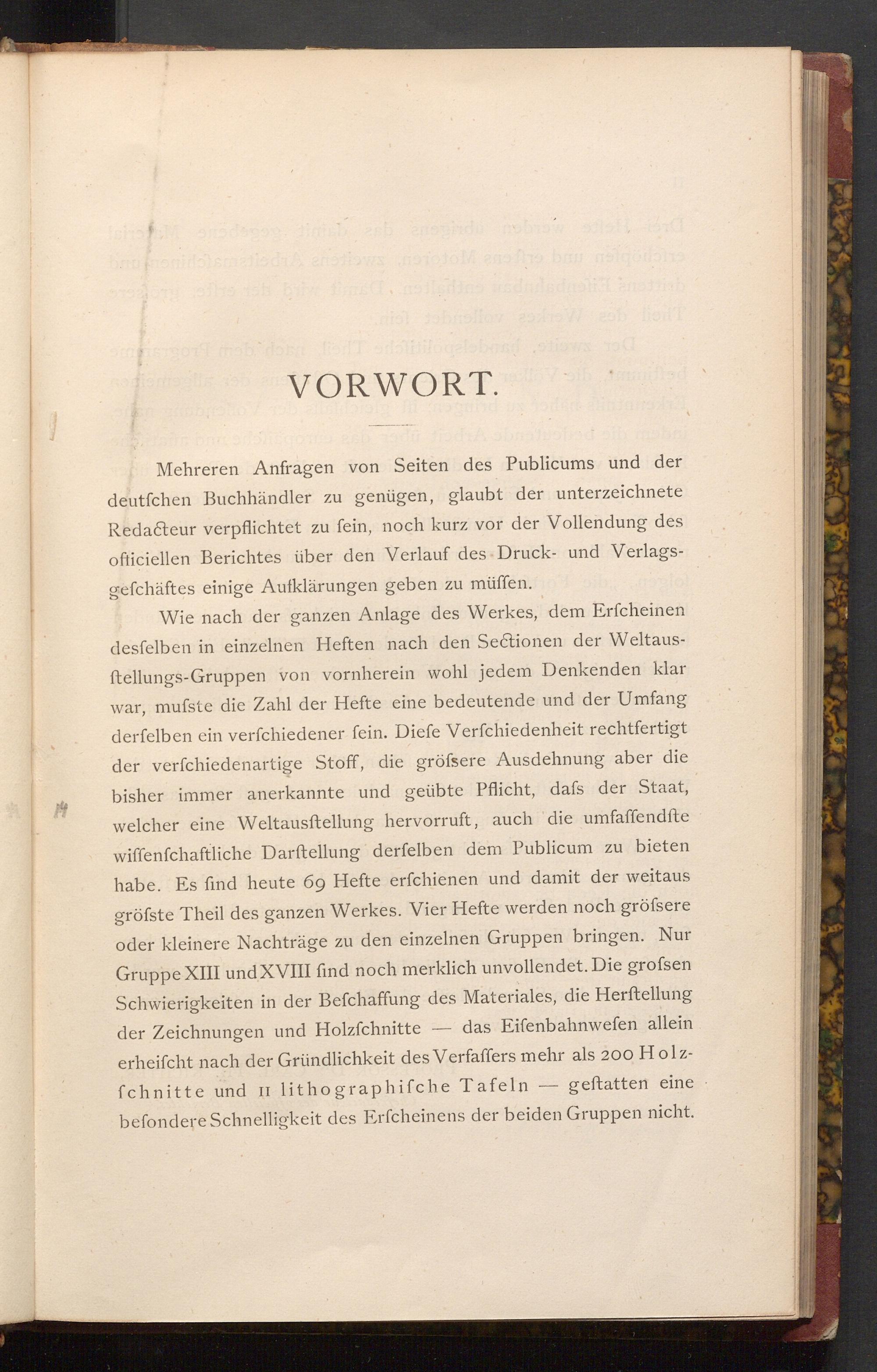 Wie nach der ganzen Anlage des Werkes, dem Erfcheinen desfelben in einzelnen Heften nach den Sectionen der Weltausftellungs- Gruppen von vornherein wohl jedem Denkenden klar war, mufste die Zahl der Hefte eine bedeutende und der Umfang derfelben ein verfchiedener fein. Diefe Verſchiedenheit rechtfertigt der verfchiedenartige Stoff, die gröfsere Ausdehnung aber die bisher immer anerkannte und geübte Pflicht, dafs der Staat, welcher eine Weltausftellung hervorruft, auch die umfaffendfte wiffenfchaftliche Darstellung derfelben dem Publicum zu bieten habe. Es find heute 69 Hefte erſchienen und damit der weitaus gröfste Theil des ganzen Werkes. Vier Hefte werden noch grössere oder kleinere Nachträge zu den einzelnen Gruppen bringen. Nur Gruppe XIII und XVIII find noch merklich unvollendet. Die grofsen Schwierigkeiten in der Befchaffung des Materiales, die Herftellung das Eifenbahnwefen allein der Zeichnungen und Holzfchnitte