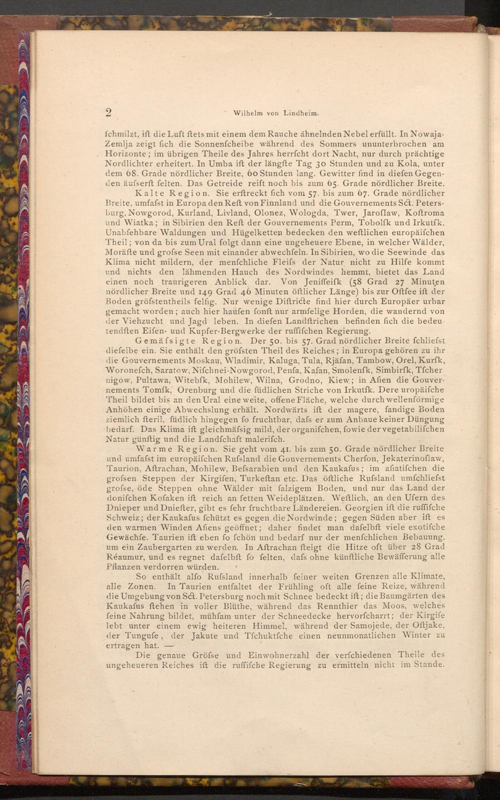 Gemäfsigte Region. Der 50. bis 57. Grad nördlicher Breite fchliefst diefelbe ein. Sie enthält den gröfsten Theil des Reiches; in Europa gehören zu ihr die Gouvernements Moskau, Wladimir, Kaluga, Tula, Rjäfan, Tambow, Orel, Kurfk, Woronefch, Saratow, Nifchnei- Nowgorod, Penfa, Kafan, Smolenfk, Simbirfk, Tfcher nigow, Pultawa, Witebfk, Mohilew, Wilna, Grodno, Kiew; in Afien die Gouvernements Tomík, Orenburg und die füdlichen Striche von Irkutfk. Dere uropäiſche Theil bildet bis an den Ural eine weite, offene Fläche, welche durch wellenförmige Anhöhen einige Abwechslung erhält. Nordwärts ift der magere, fandige Boden ziemlich fteril, füdlich hingegen fo fruchtbar, dafs er zum Anbaue keiner Düngung bedarf. Das Klima ift gleichmässig mild, der organifchen, fowie der vegetabilifchen Natur günftig und die Landfchaft malerisch.
