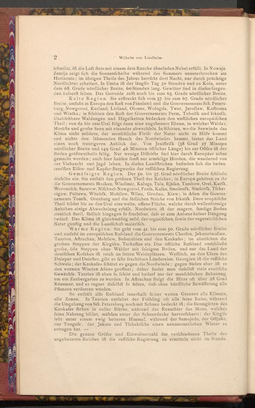 Warme Region. Sie geht vom 41. bis zum 50. Grade nördlicher Breite und umfasst im europäiſchen Rufsland die Gouvernements Cherfon, Jekaterinoflaw, Taurion, Aftrachan, Mohilew, Befsarabien und den Kaukafus; im afiatifchen die grofsen Steppen der Kirgifen, Turkeftan etc. Das öftliche Rufsland umfchliefst grofse, öde Steppen ohne Wälder mit falzigem Boden, und nur das Land der donifchen Kofaken ift reich an fetten Weideplätzen. Weftlich, an den Ufern des Dnieper und Dniefter, gibt es fehr fruchtbare Ländereien. Georgien ift die ruffifche Schweiz; der Kaukafus fchützt es gegen die Nordwinde; gegen Süden aber ift es den warmen Winden Afiens geöffnet; daher findet man dafelbft viele exotifche Gewächfe. Taurien ift eben fo fchön und bedarf nur der menfchlichen Bebauung, um ein Zaubergarten zu werden. In Aftrachan fteigt die Hitze oft über 28 Grad Réaumur, und es regnet dafelbft fo felten, dafs ohne künftliche Bewäfferung alle Pflanzen verdorren würden.