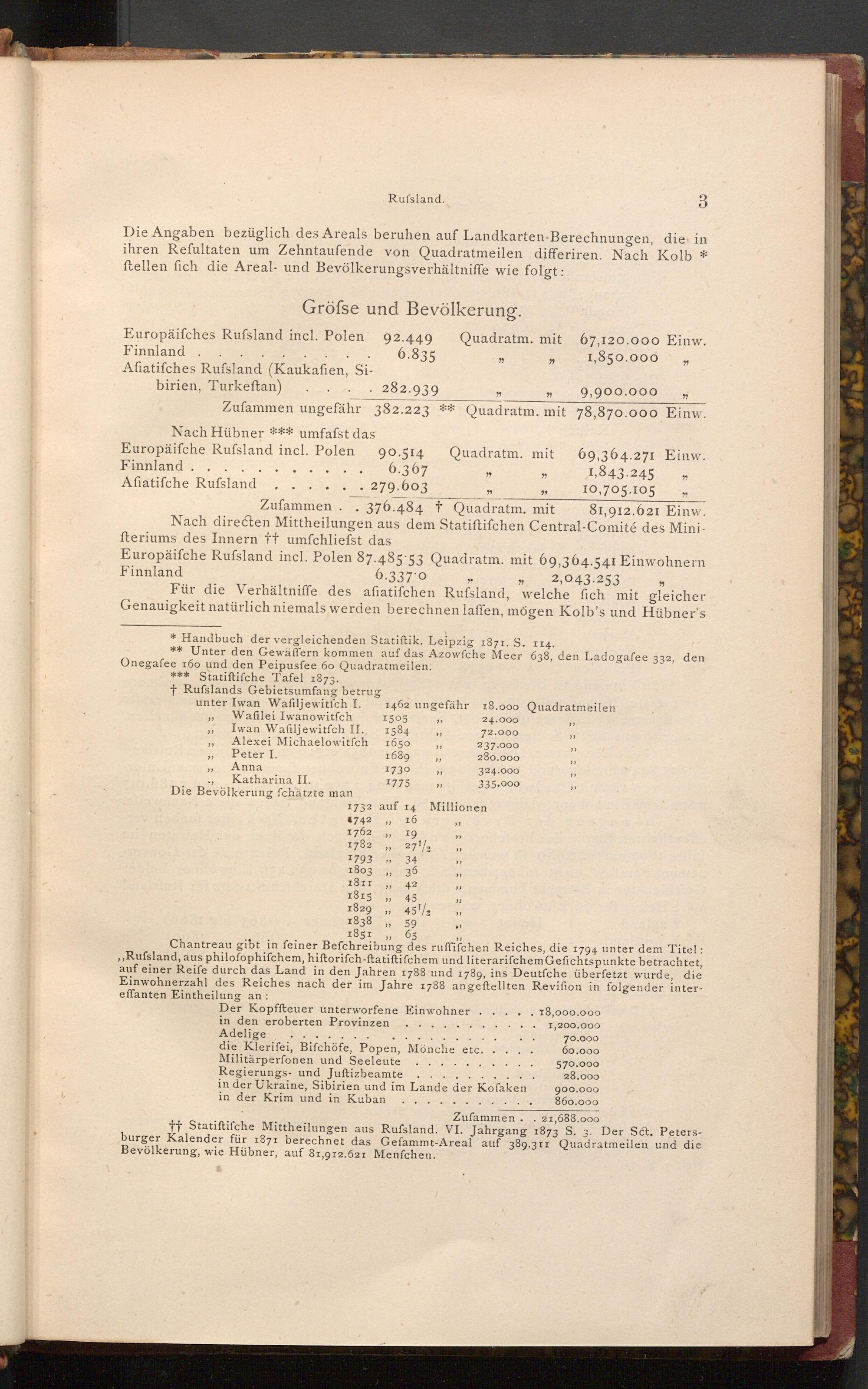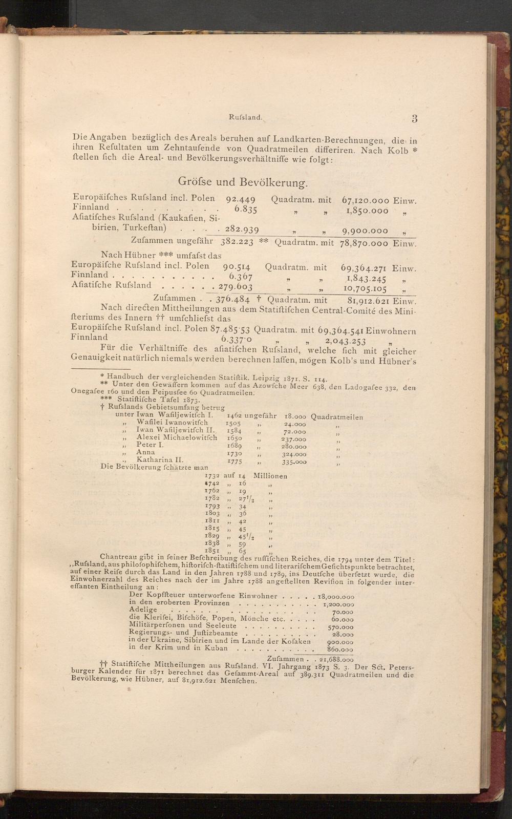 Chantreau gibt in feiner Befchreibung des ruffifchen Reiches, die 1794 unter dem Titel: ,, Rufsland, aus philofophifchem, hiftorifch- ftatiftifchem und literarifchem Gefichtspunkte betrachtet, auf einer Reife durch das Land in den Jahren 1788 und 1789, ins Deutfche überfetzt wurde, die Einwohnerzahl des Reiches nach der im Jahre 1788 angeftellten Revifion in folgender intereffanten Eintheilung an: