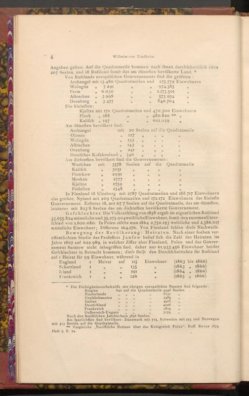 Bewegung der Bevölkerung: Heiraten. Nach einer foeben veröffentlichten Studie des Profeffors Janfon belief fich die Zahl der Heiraten im Jahre 1867 auf 622.989, in welcher Ziffer aber Finnland, Polen und das Gouvernement Saratow nicht inbegriffen find, daher nur 61,933.456 Einwohner beider Gefchlechter in Betracht kommen; diefs ftellt den Durchfchnittsfatz für Rufsland auf 1 Heirat für 99 Einwohner, während in