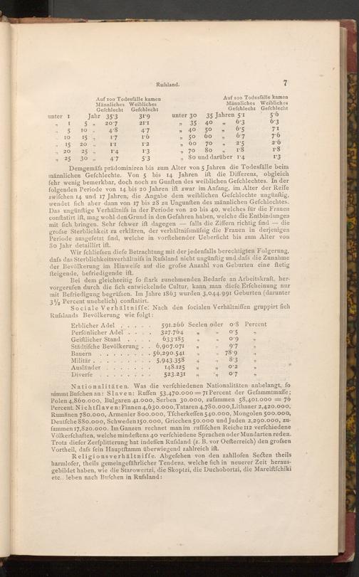 Wir fchliefsen diefe Betrachtung mit der jedenfalls berechtigten Folgerung, dafs das Sterblichkeitsverhältnifs in Rufsland nicht ungünftig und dafs die Zunahme der Bevölkerung im Hinweife auf die grofse Anzahl von Geburten eine ftetig fteigende, befriedigende ift.