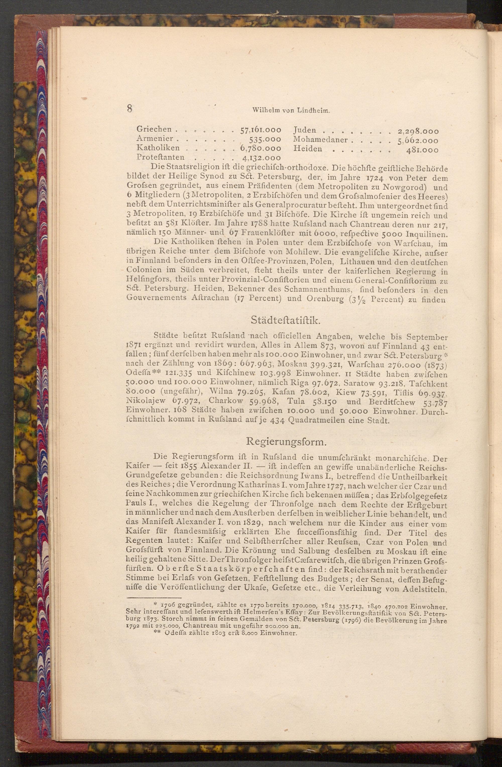 Die Regierungsform ift in Rufsland die unumfchränkt monarchifche. Der Kaiferfeit 1855 Alexander II. ift indeffen an gewiffe unabänderliche ReichsGrundgefetze gebunden: die Reichsordnung Iwans I., betreffend die Untheilbarkeit des Reiches; die Verordnung Katharinas I. vom Jahre 1727, nach welcher der Czar und feine Nachkommen zur griechifchen Kirche fich bekennen müffen; das Erbfolgegefetz Pauls I., welches die Regelung der Thronfolge nach dem Rechte der Erftgeburt in männlicher und nach dem Ausfterben derfelben in weiblicher Linie behandelt, und das Manifeft Alexander I. von 1829, nach welchem nur die Kinder aus einer vom Kaifer für ftandesmäfsig erklärten Ehe fucceffionsfähig find. Der Titel des Regenten lautet: Kaifer und Selbftherrfcher aller Reufsen, Czar von Polen und Grofsfürft von Finnland. Die Krönung und Salbung desfelben zu Moskau ift eine heilig gehaltene Sitte. Der Thronfolger heifstCæfarewitfch, die übrigen Prinzen Grofsfürften. Oberfte Staatskörperfchaften find: der Reichsrath mit berathender Stimme bei Erlafs von Gefetzen, Feftftellung des Budgets; der Senat, deffen Befugniffe die Veröffentlichung der Ukafe, Gefetze etc., die Verleihung von Adelstiteln,