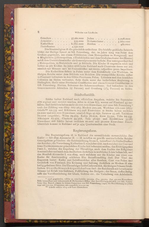 Die Staatsreligion ift die griechifch- orthodoxe. Die höchfte geiftliche Behörde bildet der Heilige Synod zu Sct. Petersburg, der, im Jahre 1724 von Peter dem Grofsen gegründet, aus einem Präfidenten( dem Metropoliten zu Nowgorod) und 6 Mitgliedern( 3 Metropoliten, 2 Erzbifchöfen und dem Grofsalmofenier des Heeres) nebft dem Unterrichtsminifter als Generalprocuratur befteht. Ihm untergeordnet find 3 Metropoliten, 19 Erzbifchöfe und 31 Bifchöfe. Die Kirche iſt ungemein reich und befitzt an 581 Klöfter. Im Jahre 1788 hatte Rufsland nach Chantreau deren nur 217, nämlich 150 Männer- und 67 Frauenklöfter mit 6000, refpective 5000 Inquilinen. Die Katholiken ftehen in Polen unter dem Erzbifchofe von Warfchau, im übrigen Reiche unter dem Bifchofe von Mohilew. Die evangelifche Kirche, aufser in Finnland befonders in den Oftfee- Provinzen, Polen, Lithauen und den deutfchen Colonien im Süden verbreitet, fteht theils unter der kaiferlichen Regierung in Helfingfors, theils unter Provinzial- Confiftorien und einem General- Confiftorium zu Sct. Petersburg. Heiden, Bekenner des Schamanenthums, find befonders in den Gouvernements Aftrachan( 17 Percent) und Orenburg( 3% Percent) zu finden