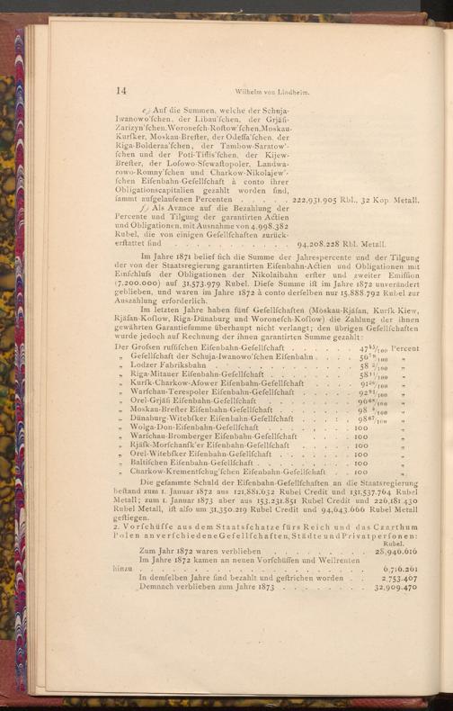 e) Auf die Summen, welche der SchujaIwanowo'fchen, der Libau'fchen, der GrjäfiZarizyn'fchen, Woronefch- Roftow' fchen, MoskauKurfker, Moskau- Brefter, der Odeffa'fchen. der Riga- Bolderaa'fchen, der Tambow- Saratow'fchen und der Poti- Tiflis'fchen, der KijewBrefter, der Lofowo- Sfewaftopoler, Landwarowo- Romny'fchen und Charkow- Nikolajew'fchen Eifenbahn- Gefellſchaft à conto ihrer Obligations capitalien gezahlt worden find, fammt aufgelaufenen Percenten