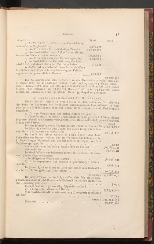 Die Gefammtfumme aller Schulden an den Reichsfchatz belief fich zum 1. Januar 1872 auf 150,828.248 Rubel Credit und 131,537.764 Rubel Metall, zum 1. Januar 1873 aber auf 186,141.321 Rubel Credit und 226,181.430 Rubel Metall, war demnach um 35,313.073 Rubel Credit und 94,643.666 Rubel Metall, im Ganzen alfo um 142,482.121 Rubel 55 Kopeken geftiegen.