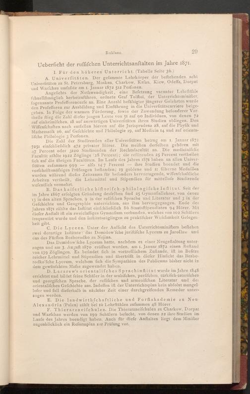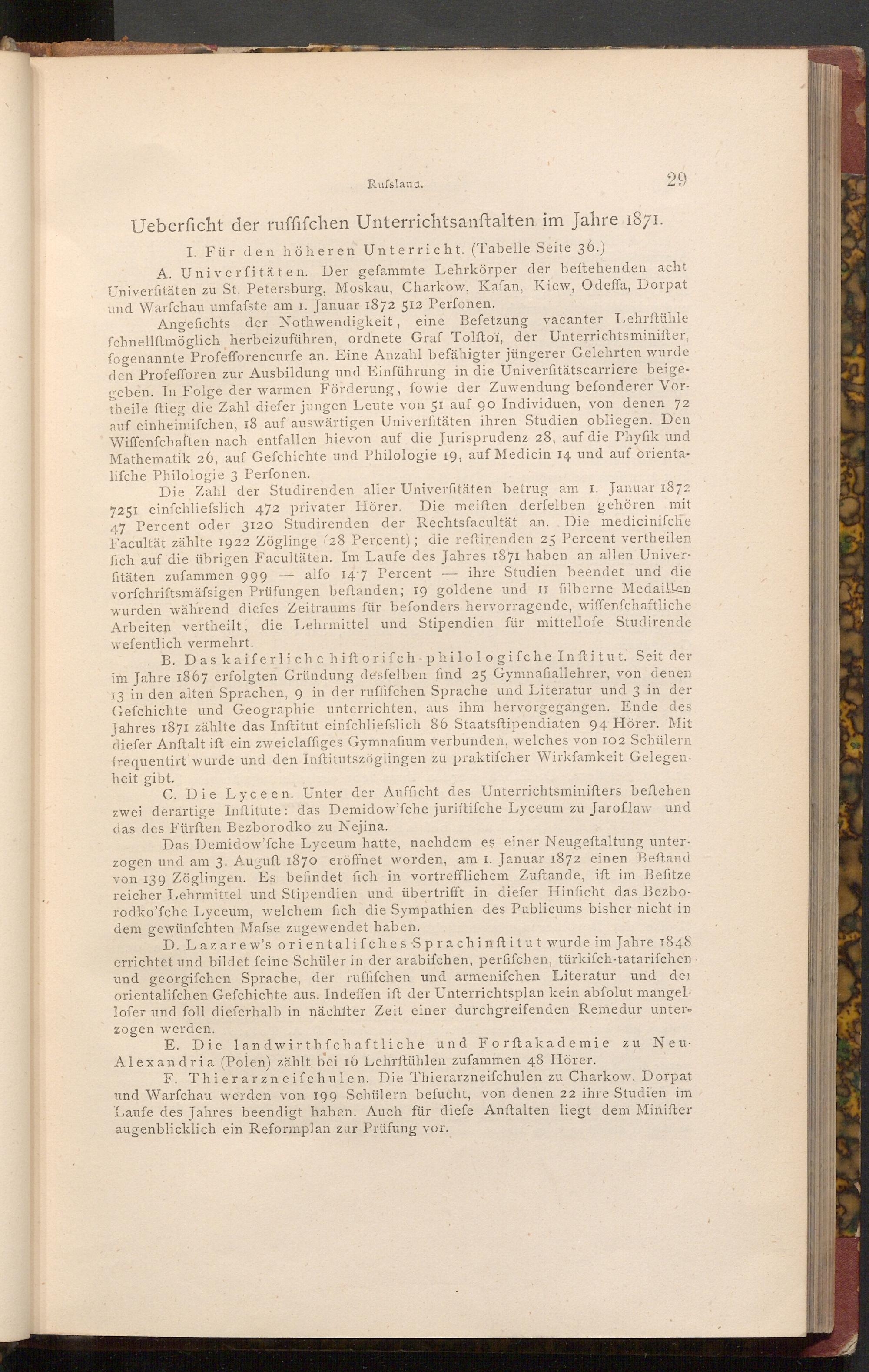 A. Univerfitäten. Der gefammte Lehrkörper der beftehenden acht Univerſitäten zu St. Petersburg, Moskau, Charkow, Kafan, Kiew, Odeffa, Dorpat und Warfchau umfafste am 1. Januar 1872 512 Perfonen.