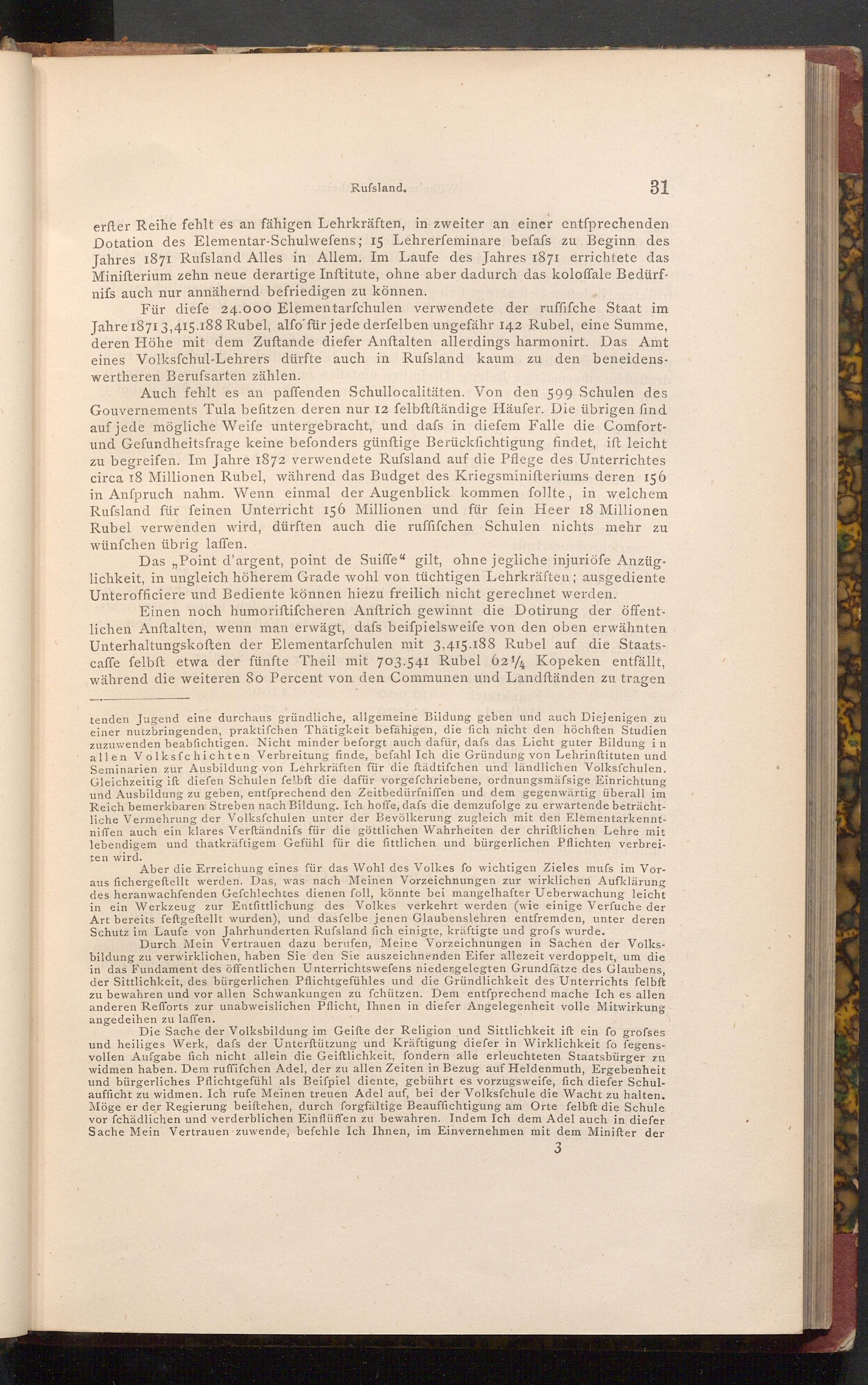 Einen noch humoriftifcheren Anftrich gewinnt die Dotirung der öffentlichen Anftalten, wenn man erwägt, dafs beiſpielsweife von den oben erwähnten Unterhaltungskoften der Elementarfchulen mit 3,415.188 Rubel auf die Staatscaffe felbft etwa der fünfte Theil mit 703.541 Rubel 624 Kopeken entfällt, während die weiteren So Percent von den Communen und Landftänden zu tragen