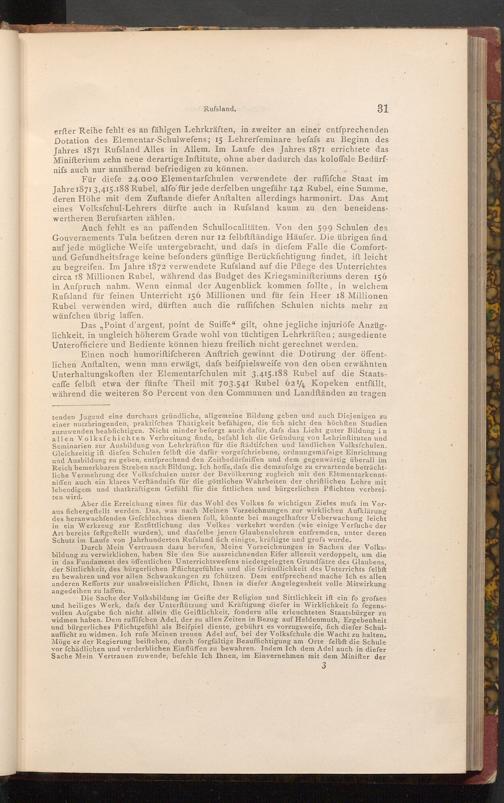 Für diefe 24.000 Elementarfchulen verwendete der ruffifche Staat im Jahre 1871 3,415.188 Rubel, alfo für jede derfelben ungefähr 142 Rubel, eine Summe, deren Höhe mit dem Zuftande diefer Anftalten allerdings harmonirt. Das Amt eines Volksfchul- Lehrers dürfte auch in Rufsland kaum zu den beneidenswertheren Berufsarten zählen.te